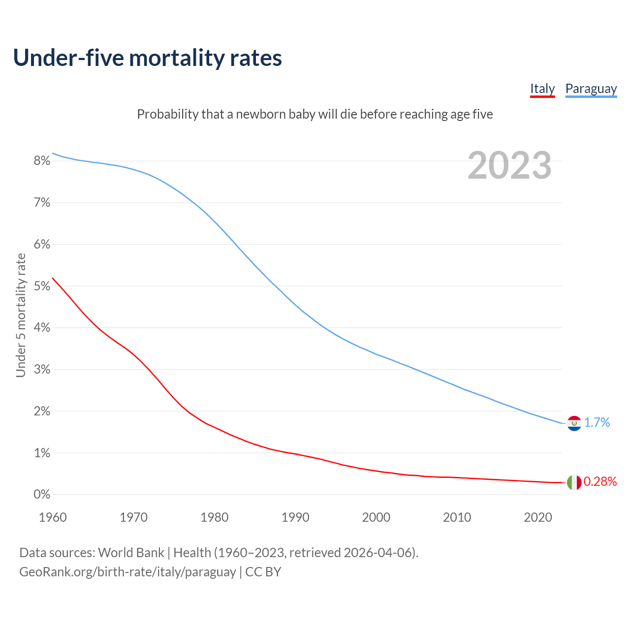 The chance that a newborn baby will die before reaching age five is 0.28% in Italy and 1.7% in Paraguay. Above is a chart with historical data on under-five mortality rates.