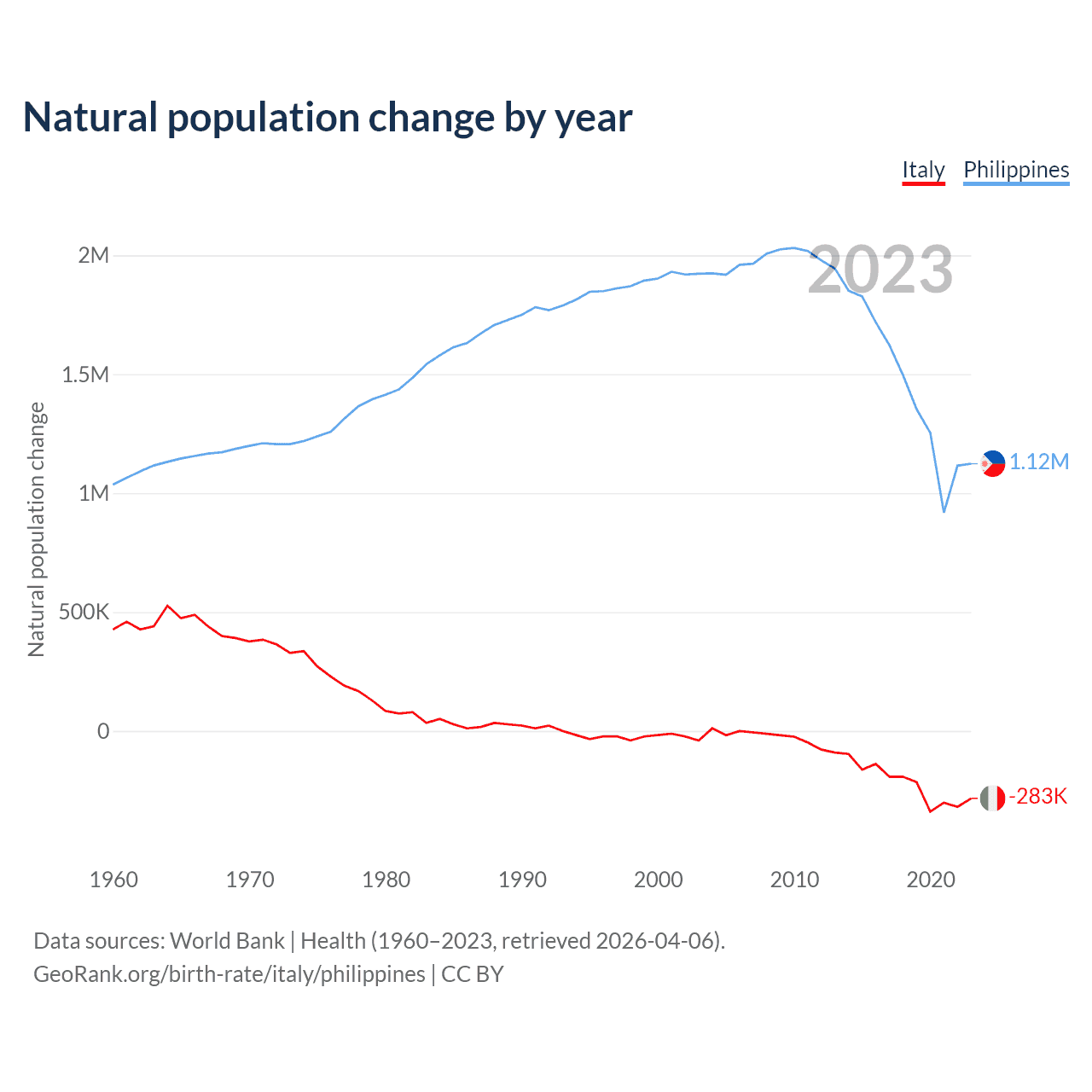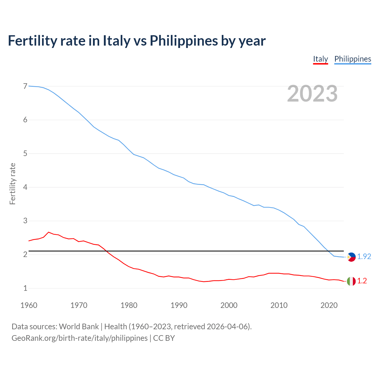 According to the latest available data on birth rates, the fertility rate in Italy was 1.2 children per woman in 2023, compared to 1.92 in the Philippines in 2023. The replacement level is considered to be 2.1 children per woman.