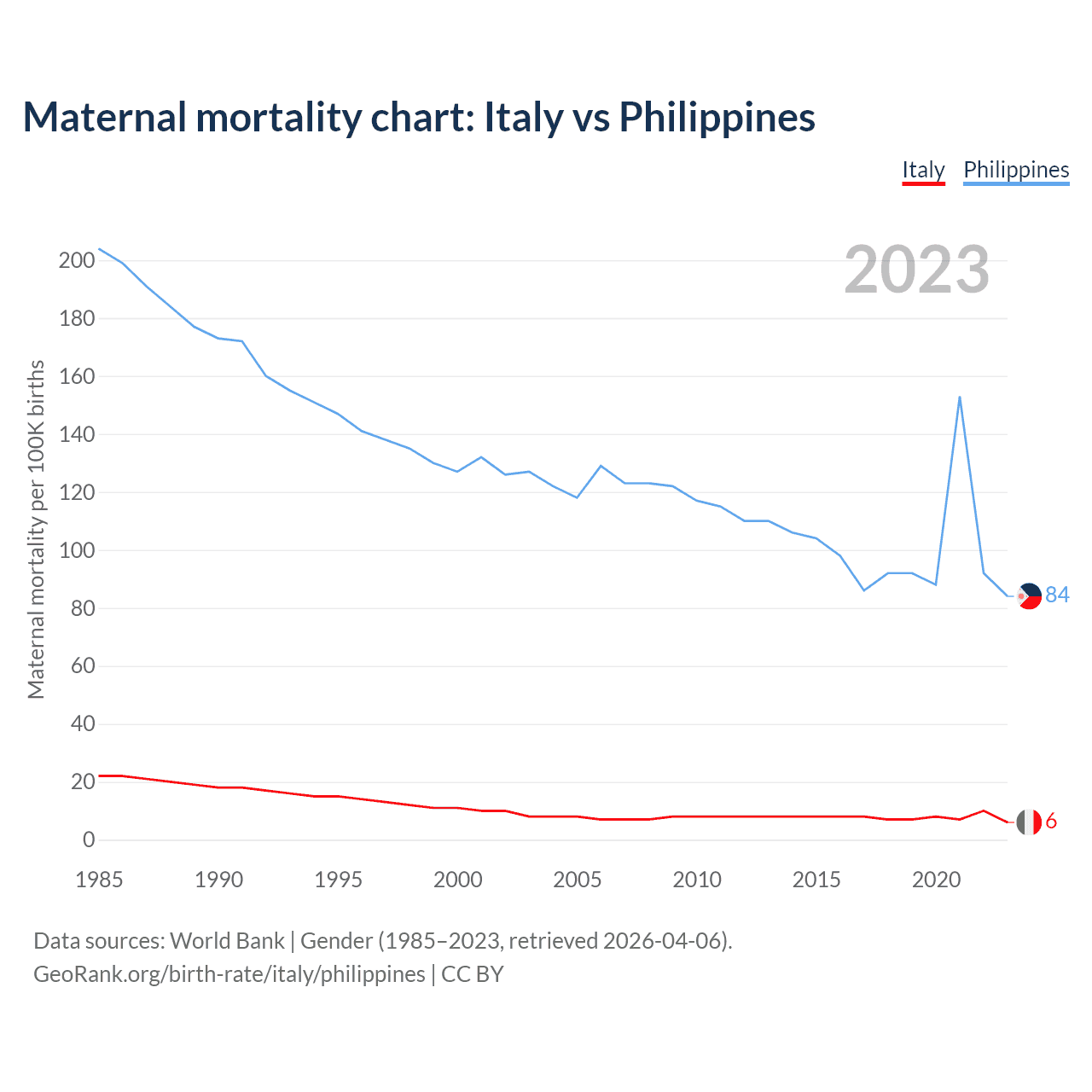 The maternal mortality rate, which is the probability of dying during childbirth or within 42 days of pregnancy termination, is 6 deaths per 100,000 live births in Italy, compared to 84 deaths in the Philippines.