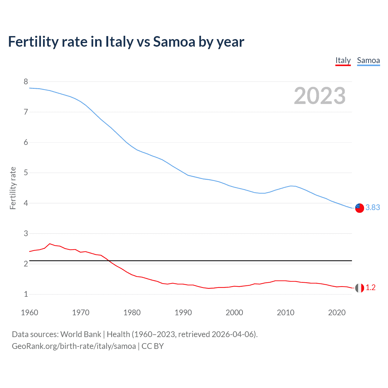 According to the latest available data on birth rates, the fertility rate in Italy was 1.2 children per woman in 2023, compared to 3.83 in Samoa in 2023. The replacement level is considered to be 2.1 children per woman.