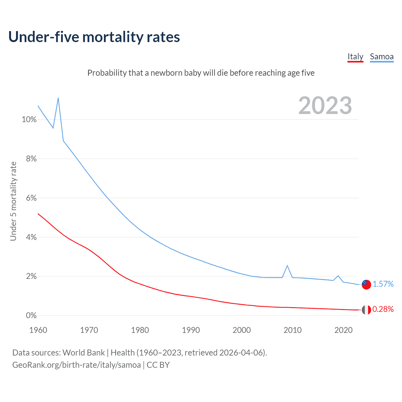 The chance that a newborn baby will die before reaching age five is 0.28% in Italy and 1.57% in Samoa. Above is a chart with historical data on under-five mortality rates.