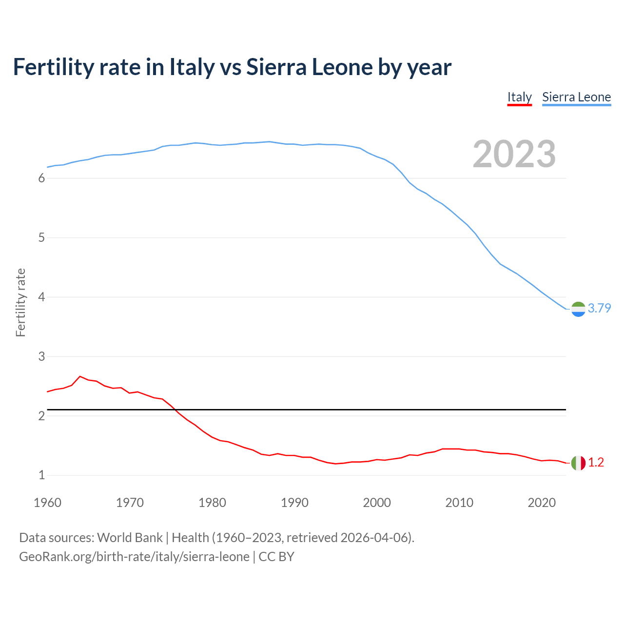 1960 vs 2023, the fertility rate has decreased by 50% in Italy and by 38.6% in Sierra Leone — in 1960, it was 2.4 and 6.18, respectively.