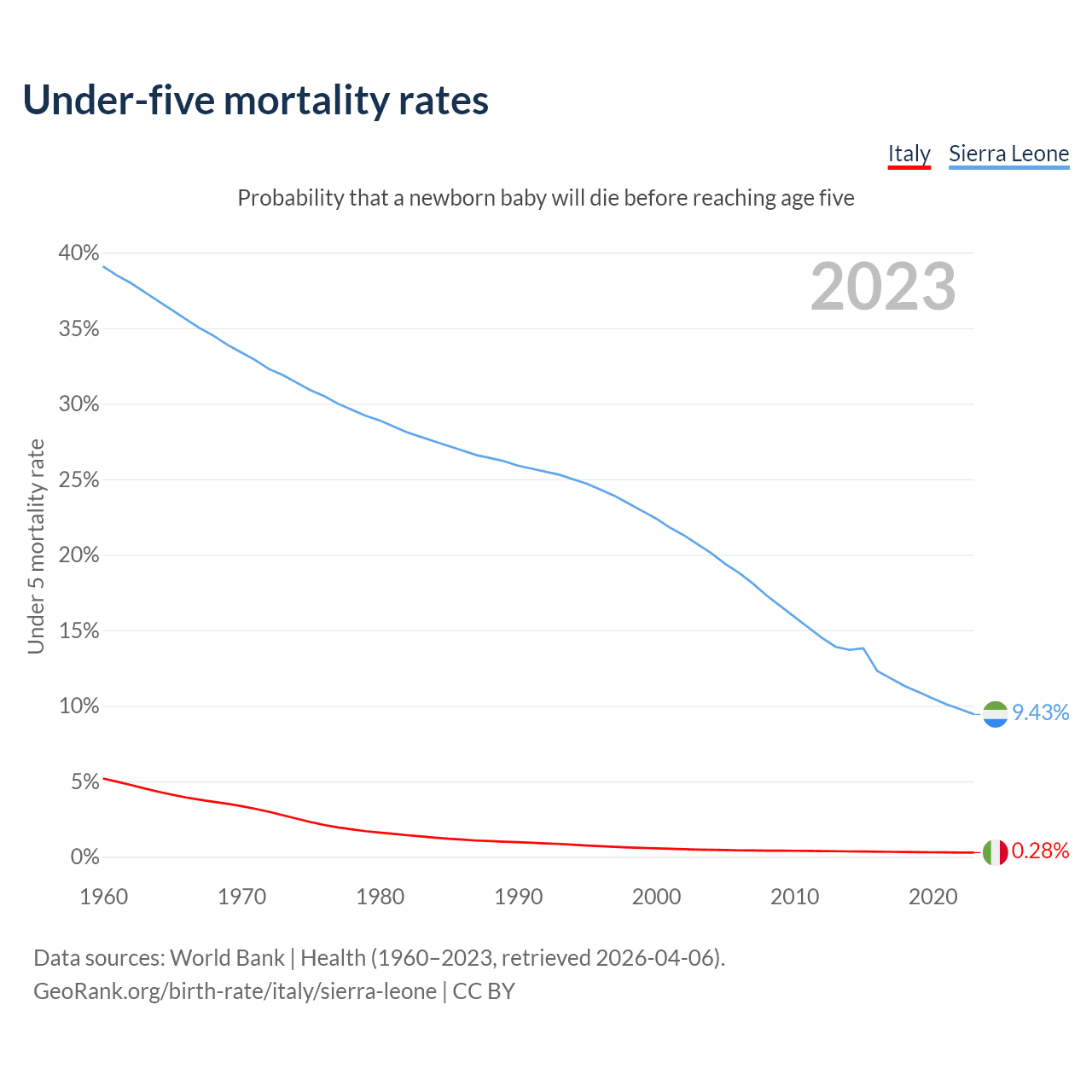The chance that a newborn baby will die before reaching age five is 0.28% in Italy and 9.43% in Sierra Leone. Above is a chart with historical data on under-five mortality rates.