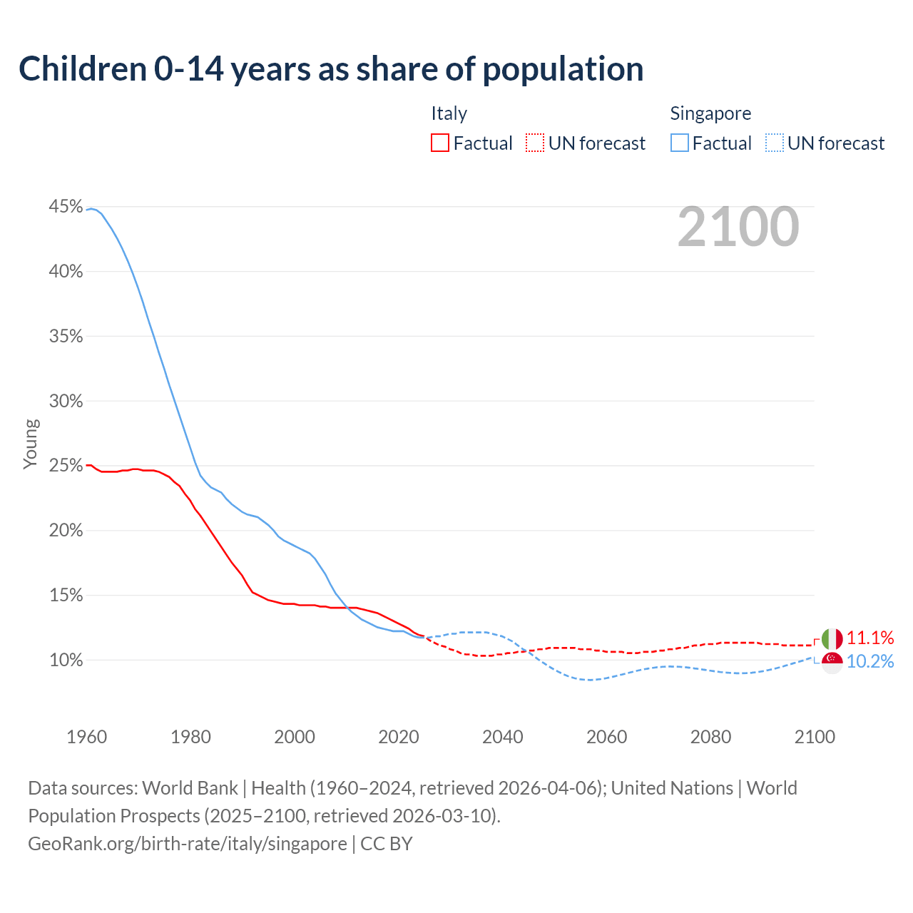 According to the latest available data on birth rates, the fertility rate in Italy was 1.2 children per woman in 2023, compared to 0.97 in Singapore in 2023. The replacement level is considered to be 2.1 children per woman.
