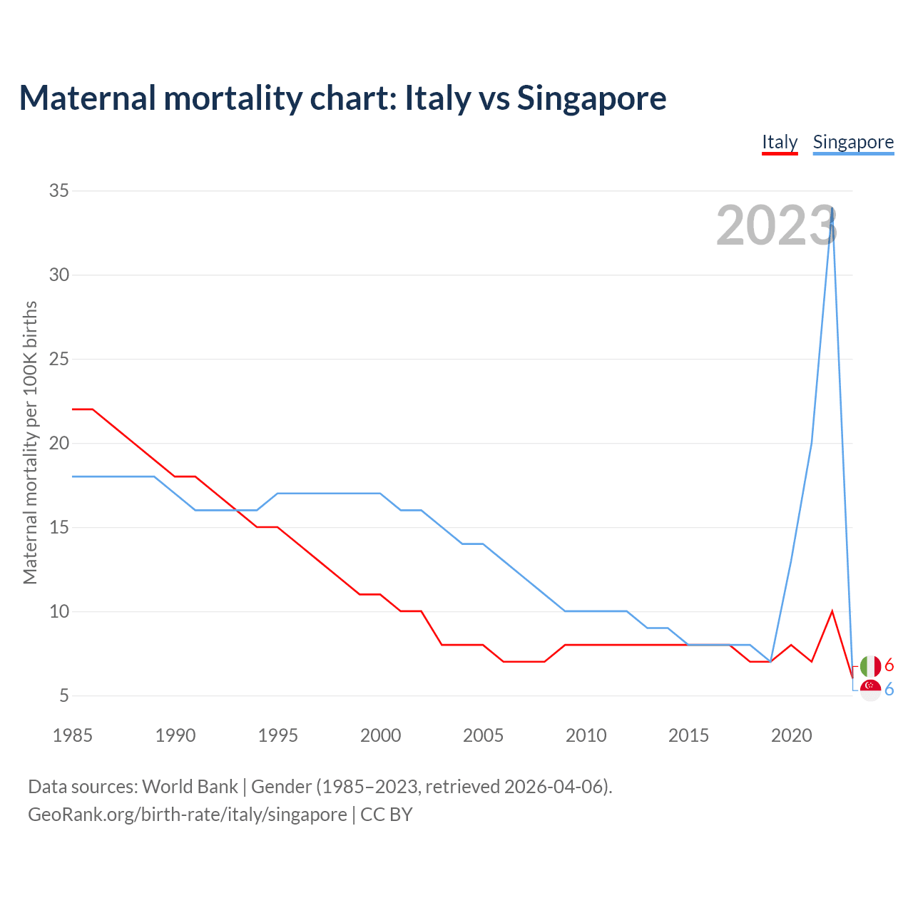 The maternal mortality rate, which is the probability of dying during childbirth or within 42 days of pregnancy termination, is 6 deaths per 100,000 live births in Italy, compared to 6 deaths in Singapore.
