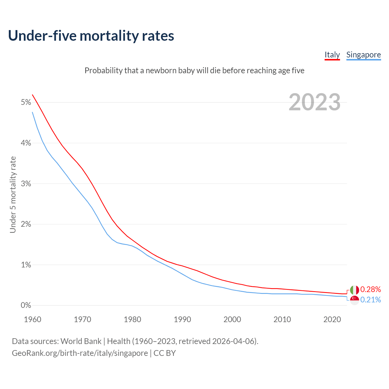 The chance that a newborn baby will die before reaching age five is 0.28% in Italy and 0.21% in Singapore. Above is a chart with historical data on under-five mortality rates.