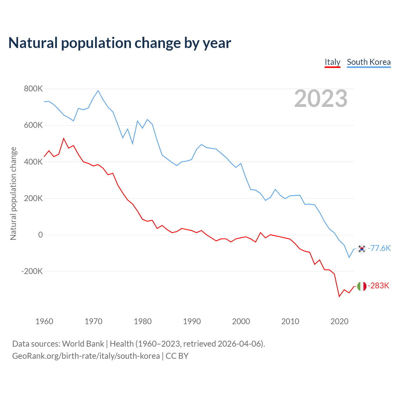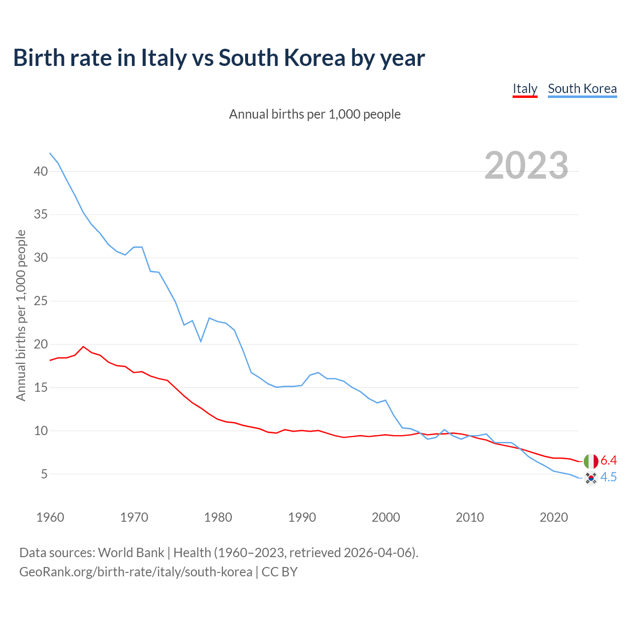 According to the latest available data on birth rates, the fertility rate in Italy was 1.2 children per woman in 2023, compared to 0.72 in South Korea in 2023. The replacement level is considered to be 2.1 children per woman.