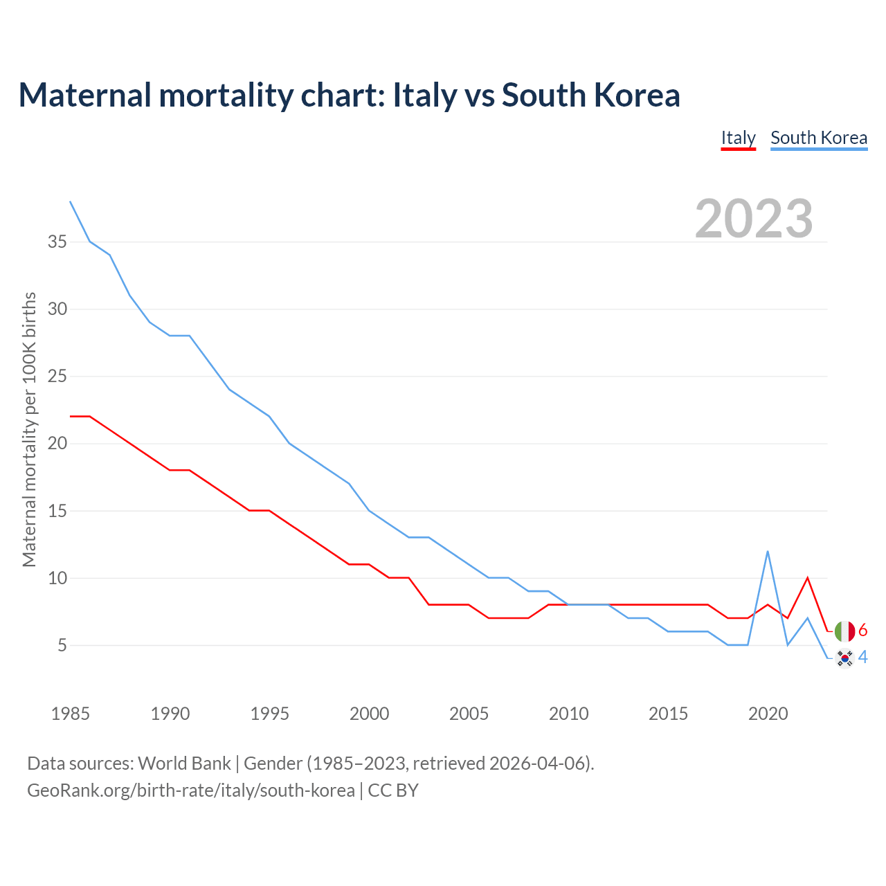 The maternal mortality rate, which is the probability of dying during childbirth or within 42 days of pregnancy termination, is 6 deaths per 100,000 live births in Italy, compared to 4 deaths in South Korea.
