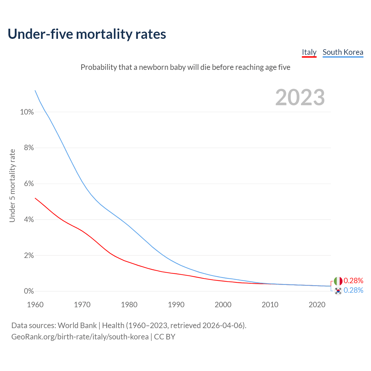 The chance that a newborn baby will die before reaching age five is 0.28% in Italy and 0.28% in South Korea. Above is a chart with historical data on under-five mortality rates.