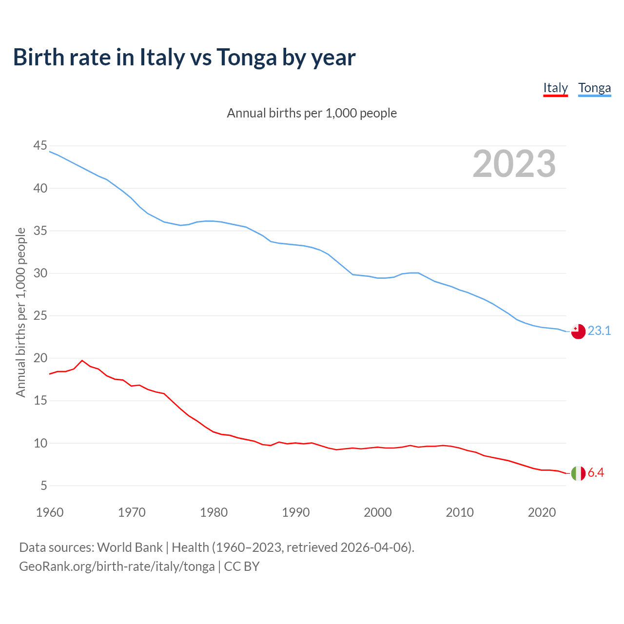 Italy has an annual birth rate of 6.4 births per 1,000 people, compared to 23.1 for Tonga. The average number of children a woman is expected to have during her lifetime — the fertility rate, is 1.2 in Italy and 3.13 in Tonga — 160.8% difference.