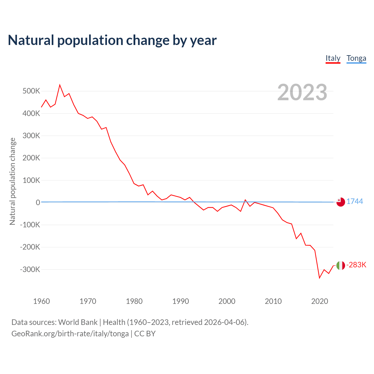 According to the latest available data on birth rates, the fertility rate in Italy was 1.2 children per woman in 2023, compared to 3.13 in Tonga in 2023. The replacement level is considered to be 2.1 children per woman.