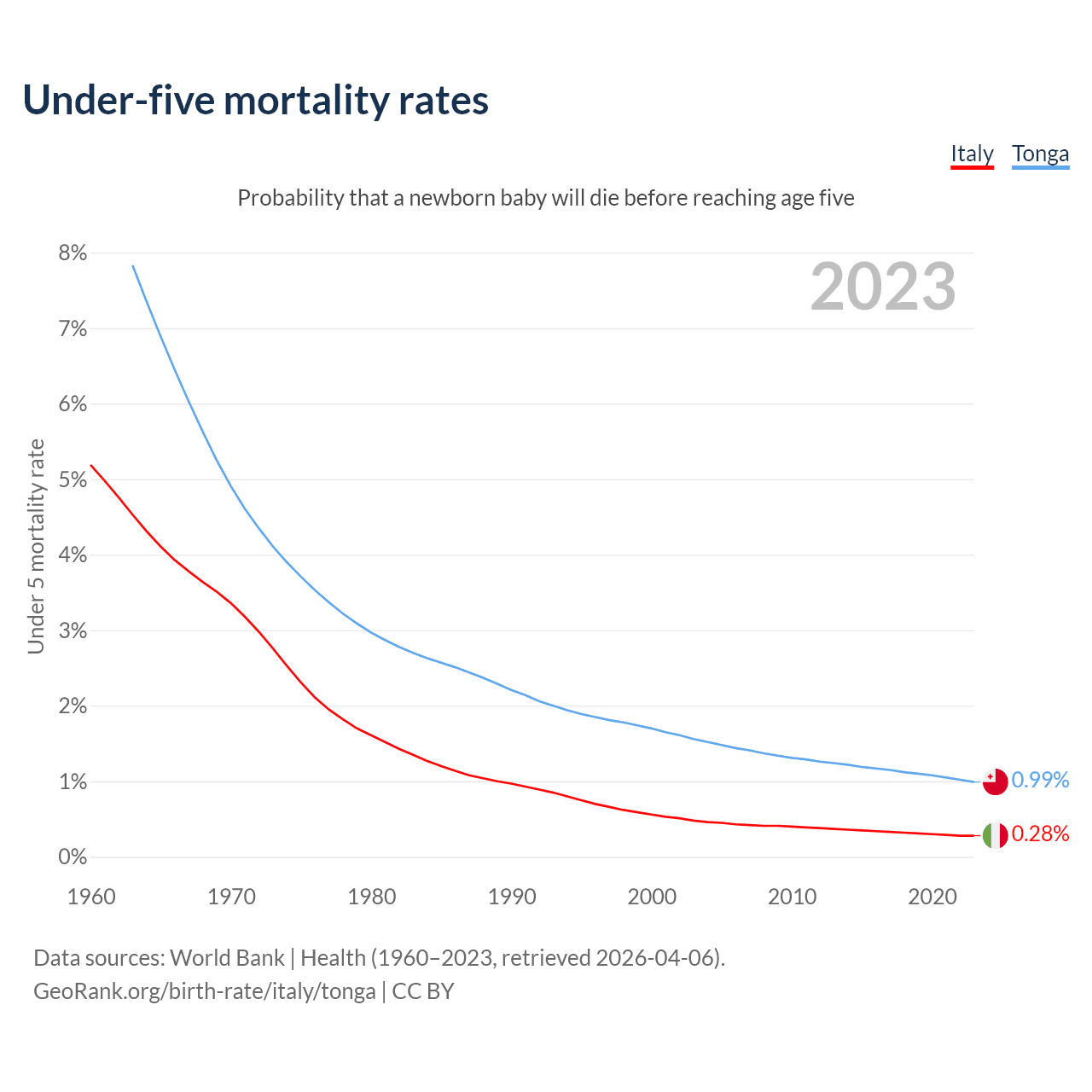 The chance that a newborn baby will die before reaching age five is 0.28% in Italy and 0.99% in Tonga. Above is a chart with historical data on under-five mortality rates.