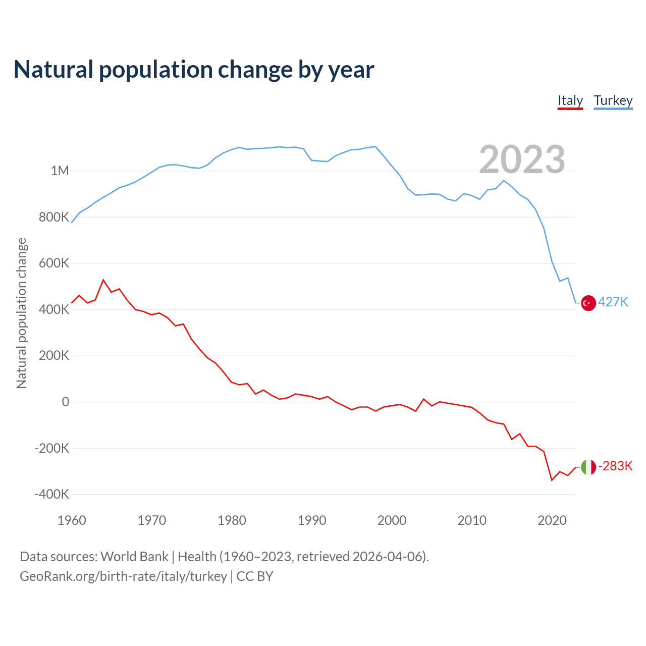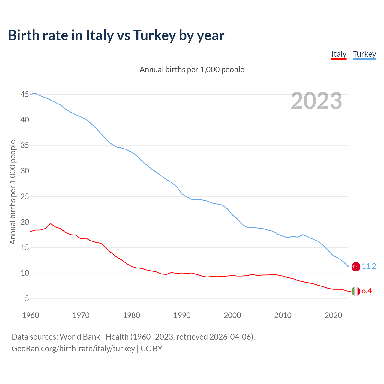 According to the latest available data on birth rates, the fertility rate in Italy was 1.2 children per woman in 2023, compared to 1.51 in Turkey in 2023. The replacement level is considered to be 2.1 children per woman.