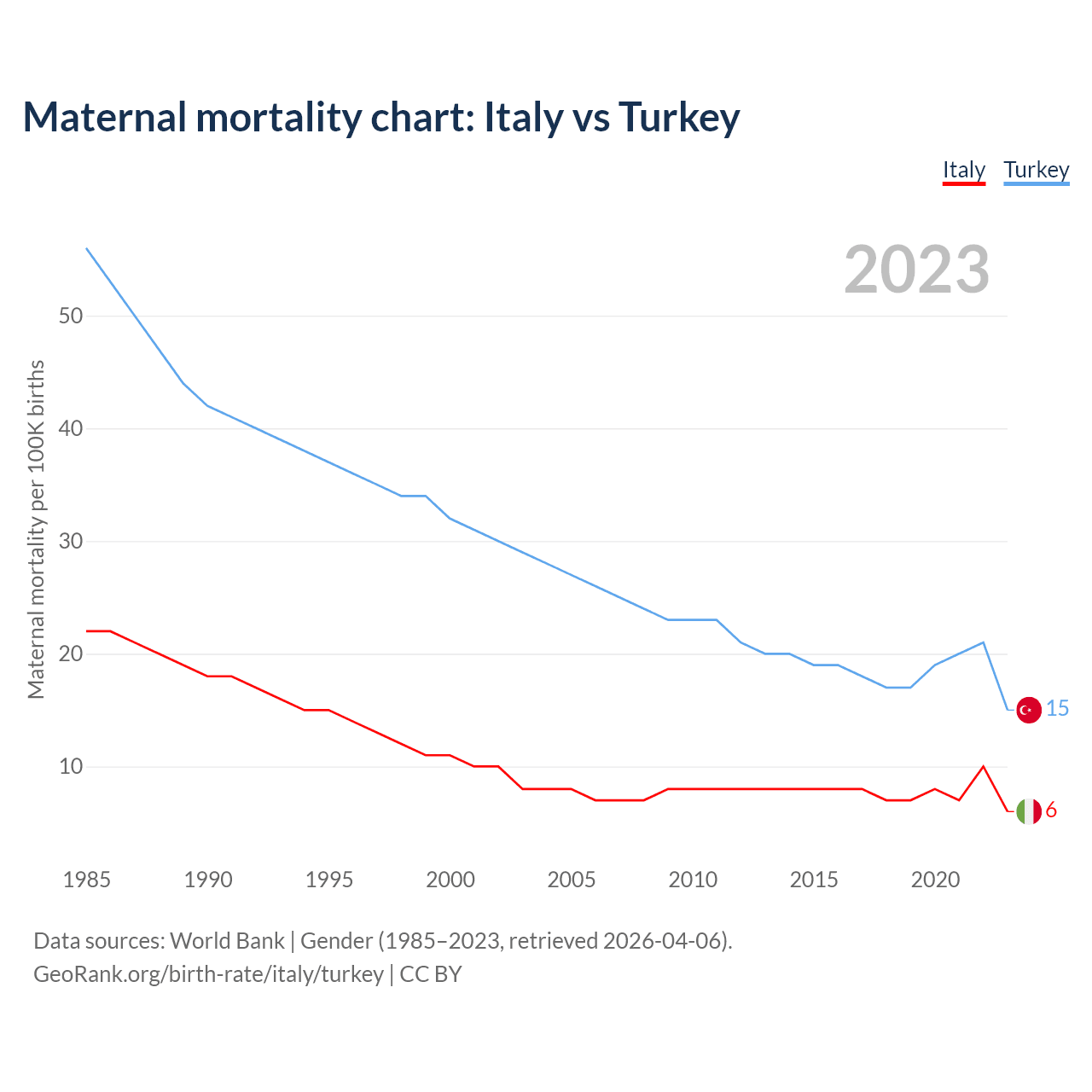 The maternal mortality rate, which is the probability of dying during childbirth or within 42 days of pregnancy termination, is 6 deaths per 100,000 live births in Italy, compared to 15 deaths in Turkey.
