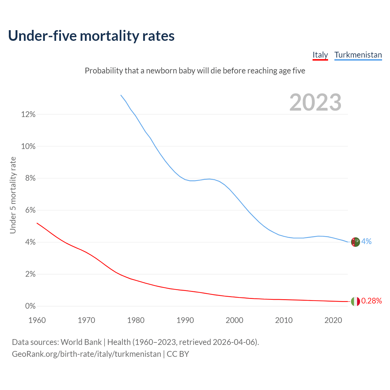 The chance that a newborn baby will die before reaching age five is 0.28% in Italy and 4% in Turkmenistan. Above is a chart with historical data on under-five mortality rates.