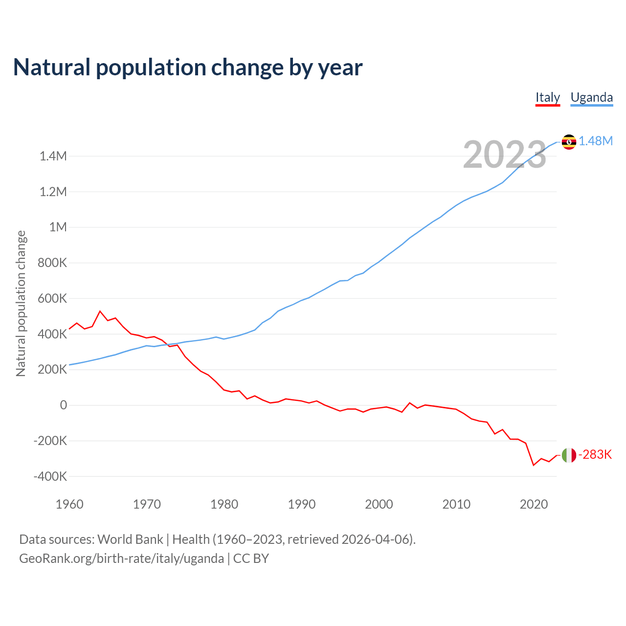 According to the latest available data on birth rates, the fertility rate in Italy was 1.2 children per woman in 2023, compared to 4.28 in Uganda in 2023. The replacement level is considered to be 2.1 children per woman.