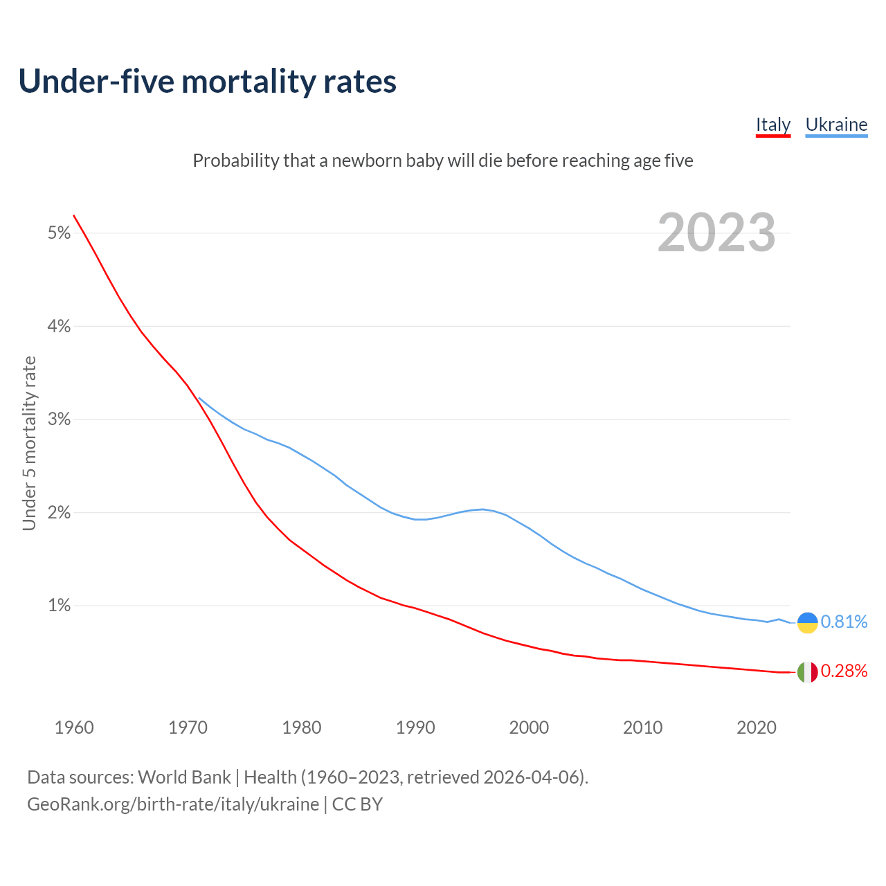 The chance that a newborn baby will die before reaching age five is 0.28% in Italy and 0.81% in Ukraine. Above is a chart with historical data on under-five mortality rates.