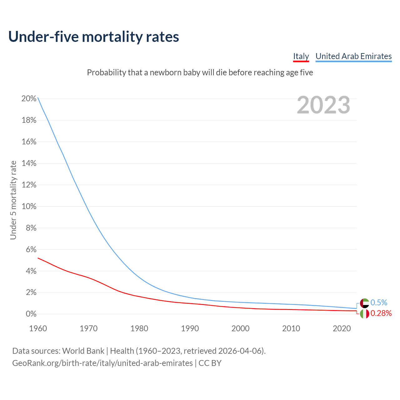 The chance that a newborn baby will die before reaching age five is 0.28% in Italy and 0.5% in the United Arab Emirates. Above is a chart with historical data on under-five mortality rates.