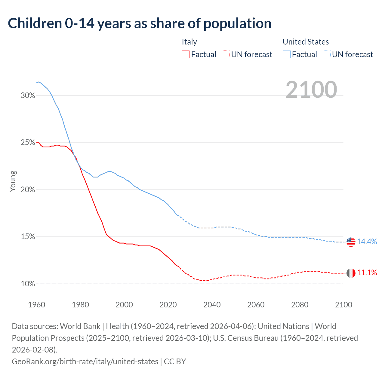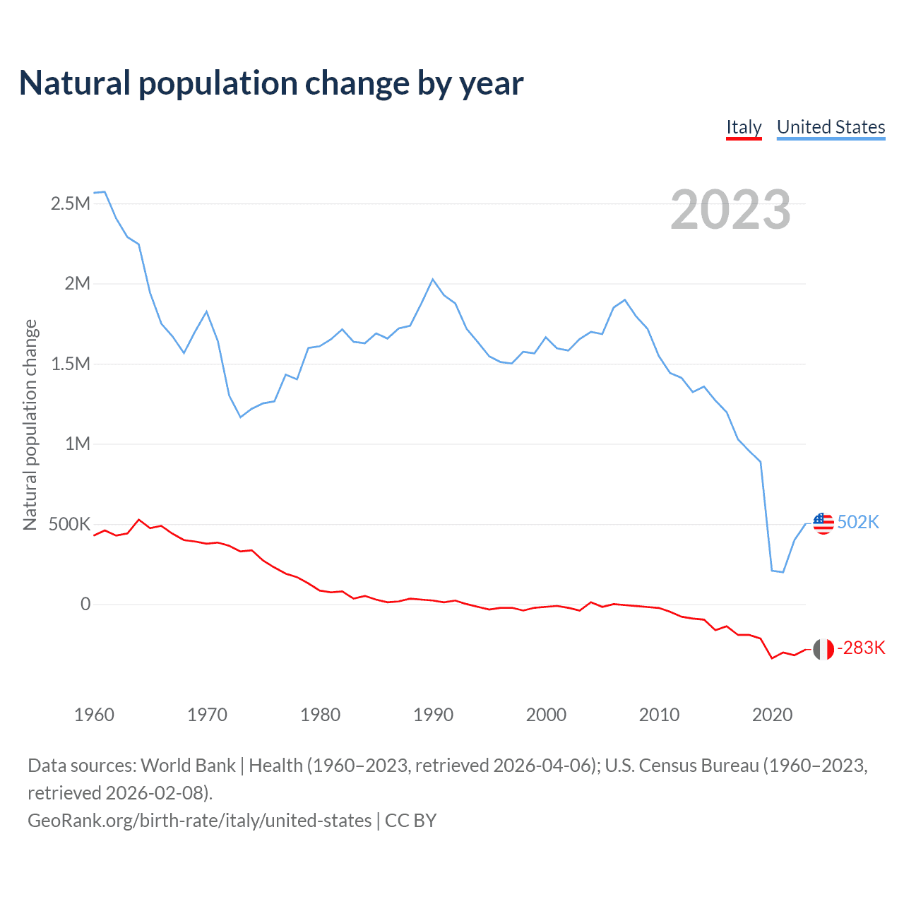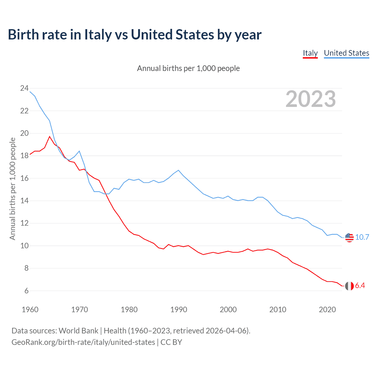According to the latest available data on birth rates, the fertility rate in Italy was 1.2 children per woman in 2023, compared to 1.62 in the United States in 2023. The replacement level is considered to be 2.1 children per woman.