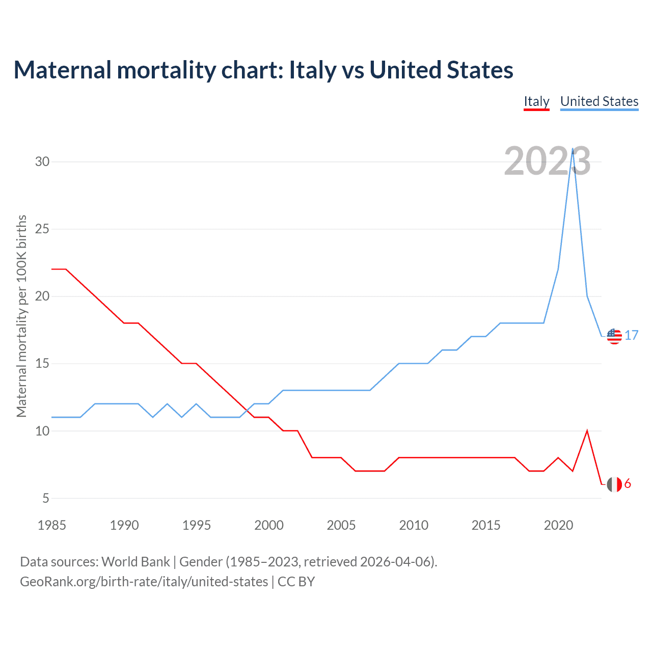 The maternal mortality rate, which is the probability of dying during childbirth or within 42 days of pregnancy termination, is 6 deaths per 100,000 live births in Italy, compared to 17 deaths in the United States.