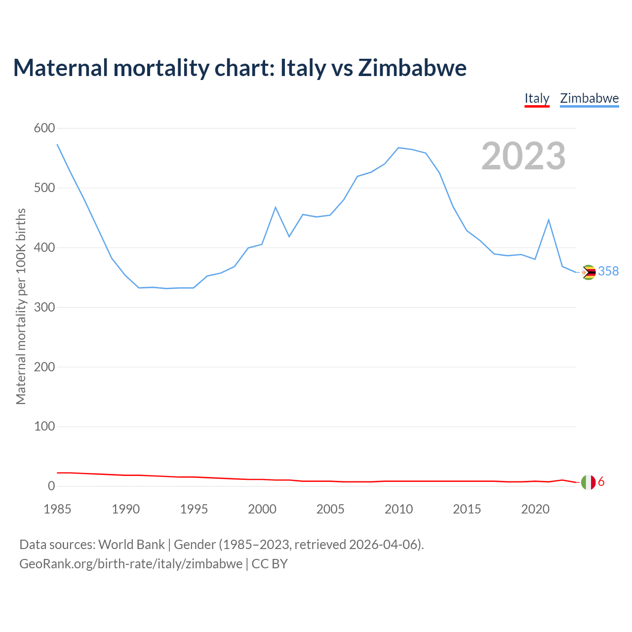 The maternal mortality rate, which is the probability of dying during childbirth or within 42 days of pregnancy termination, is 6 deaths per 100,000 live births in Italy, compared to 358 deaths in Zimbabwe.