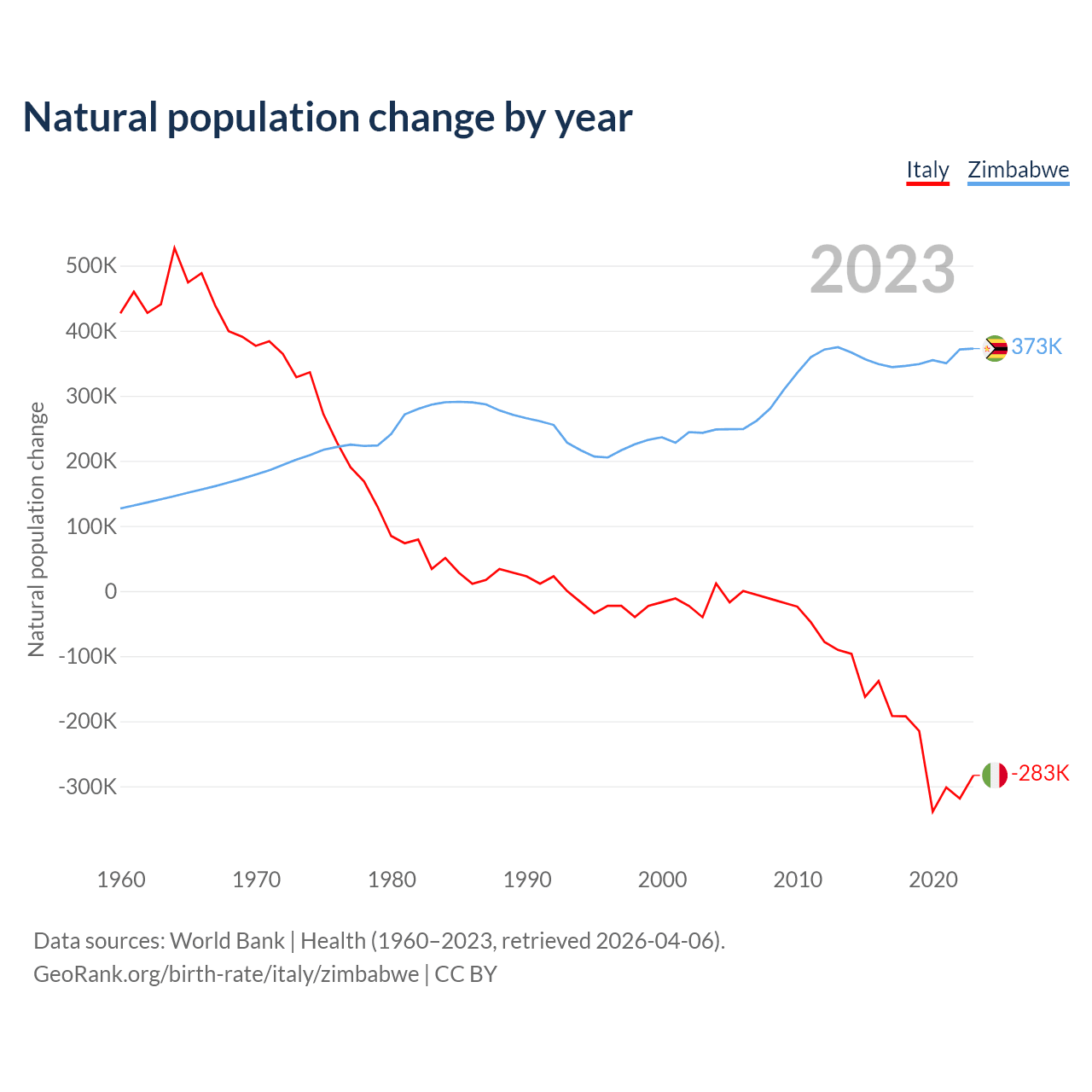 Italy has an annual birth rate of 6.4 births per 1,000 people, compared to 30.4 for Zimbabwe. The average number of children a woman is expected to have during her lifetime — the fertility rate, is 1.2 in Italy and 3.72 in Zimbabwe — 210.3% difference.