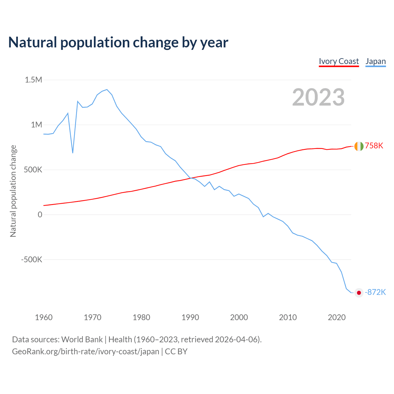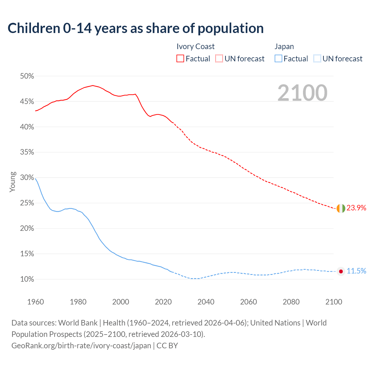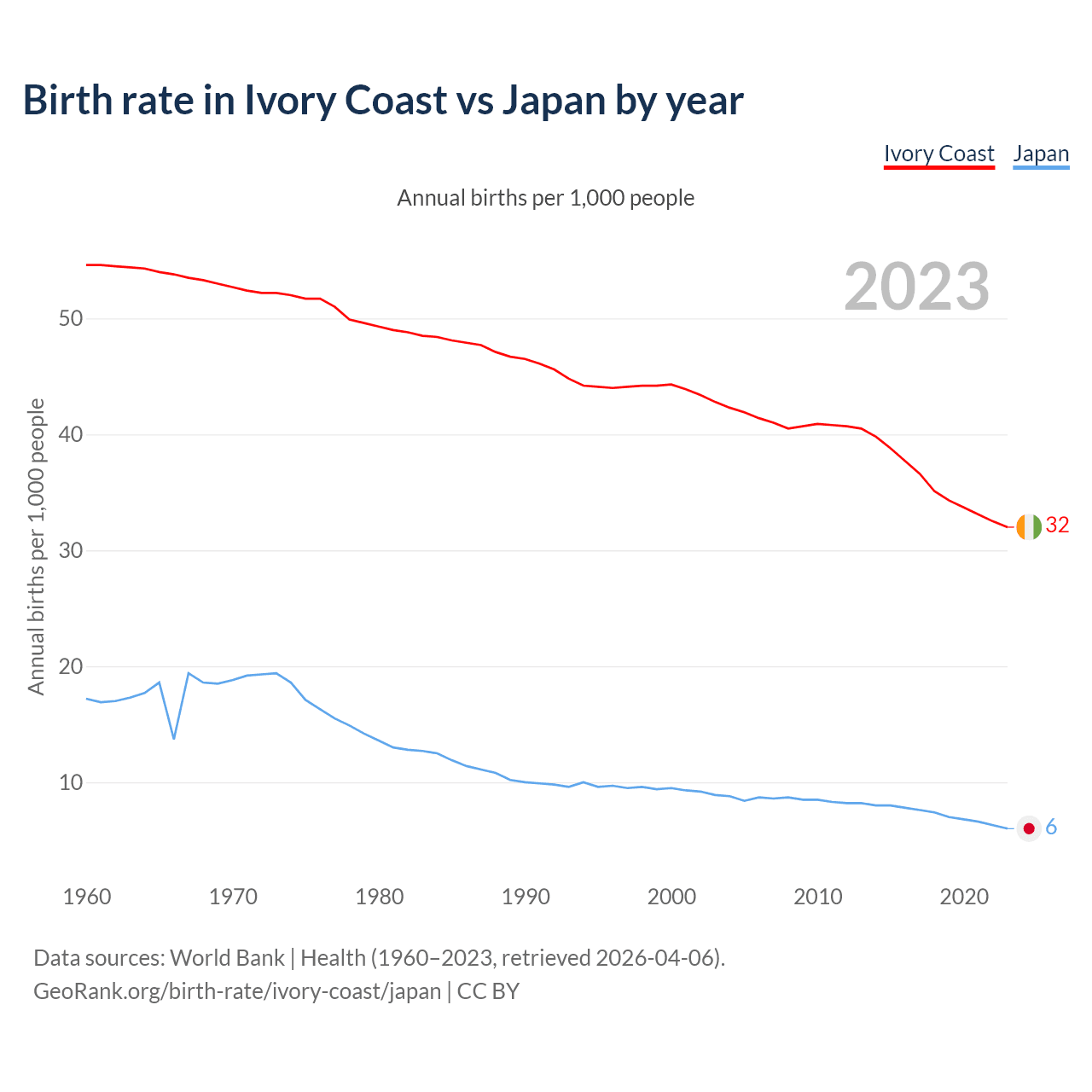 Ivory Coast has an annual birth rate of 32 births per 1,000 people, compared to 6 for Japan. The average number of children a woman is expected to have during her lifetime — the fertility rate, is 4.28 in Ivory Coast and 1.2 in Japan — 72% difference.