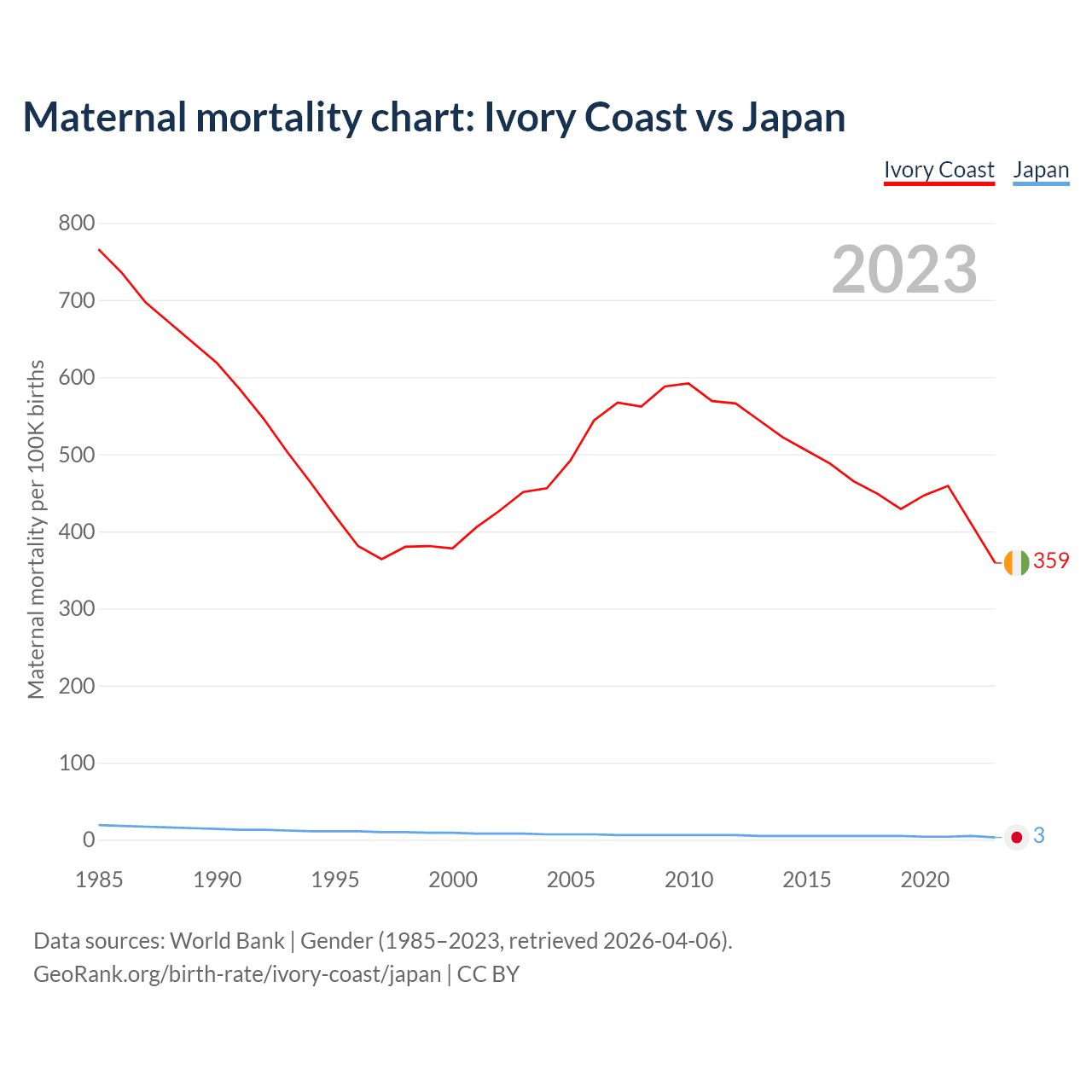 The maternal mortality rate, which is the probability of dying during childbirth or within 42 days of pregnancy termination, is 359 deaths per 100,000 live births in Ivory Coast, compared to 3 deaths in Japan.