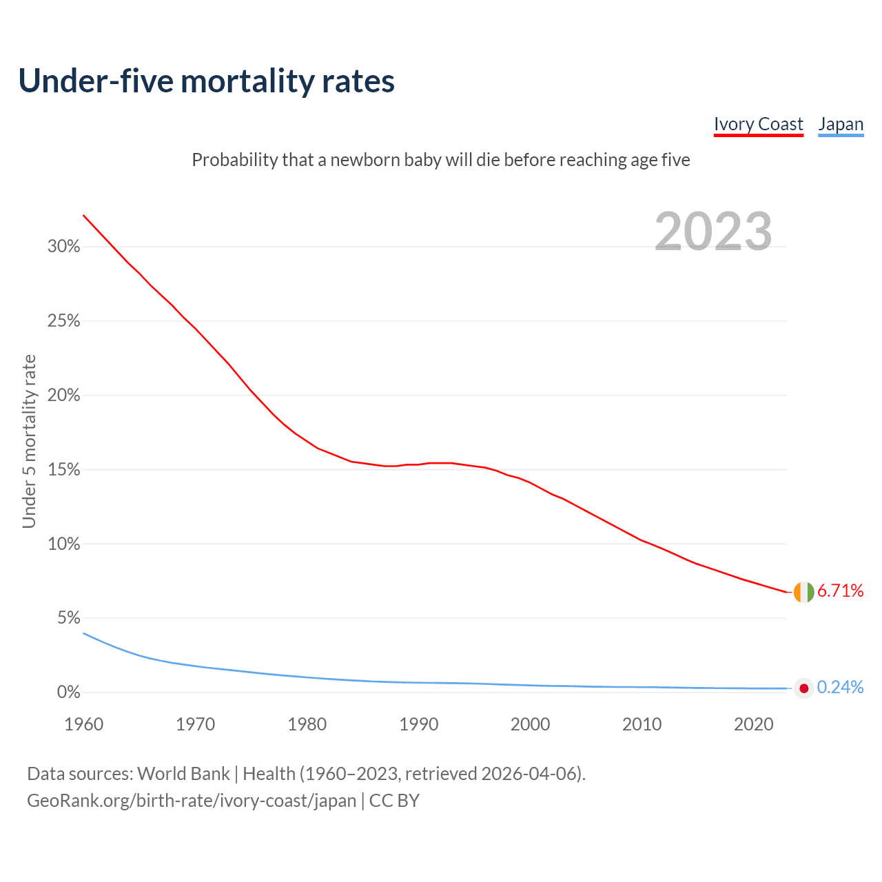 The chance that a newborn baby will die before reaching age five is 6.71% in Ivory Coast and 0.24% in Japan. Above is a chart with historical data on under-five mortality rates.