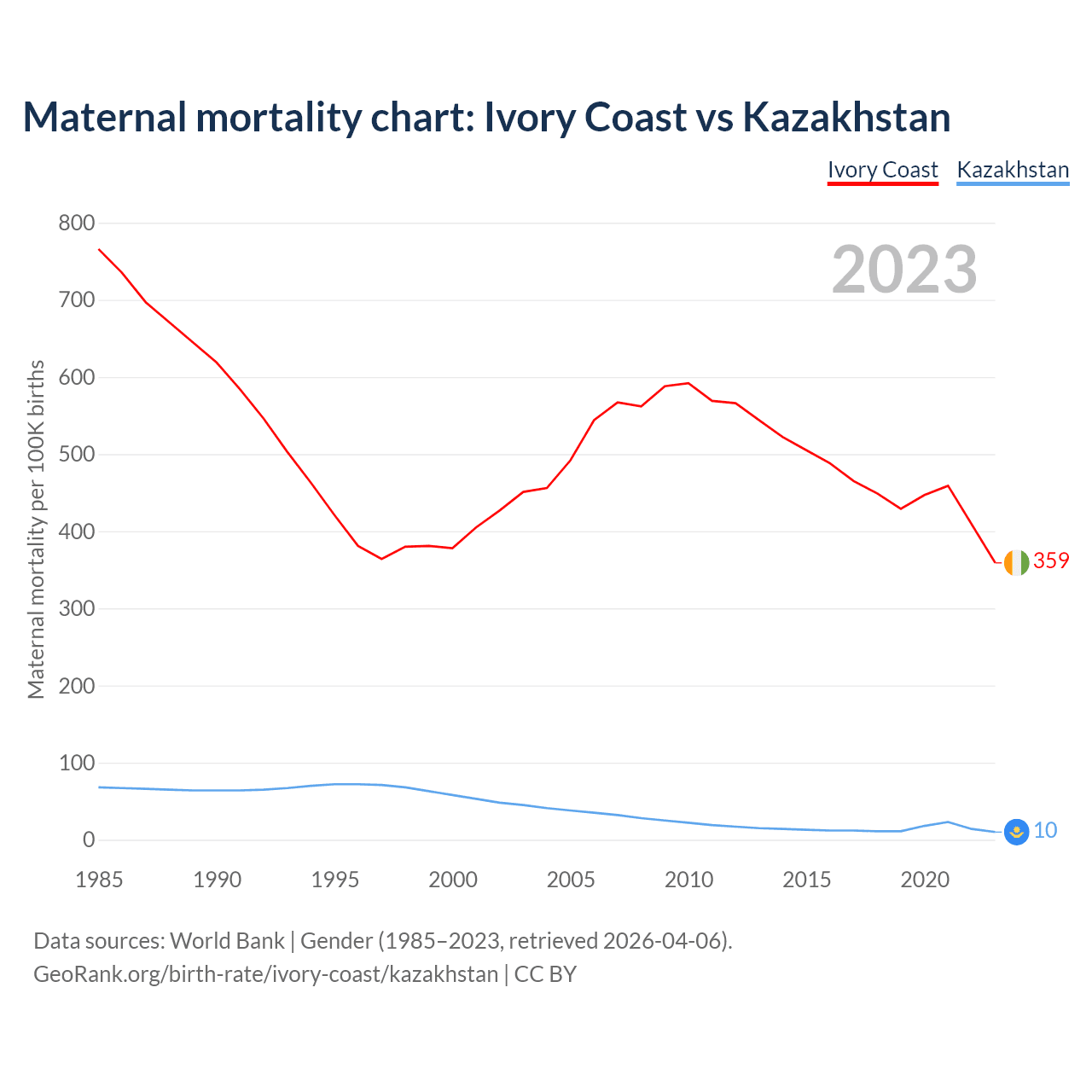 The maternal mortality rate, which is the probability of dying during childbirth or within 42 days of pregnancy termination, is 359 deaths per 100,000 live births in Ivory Coast, compared to 10 deaths in Kazakhstan.