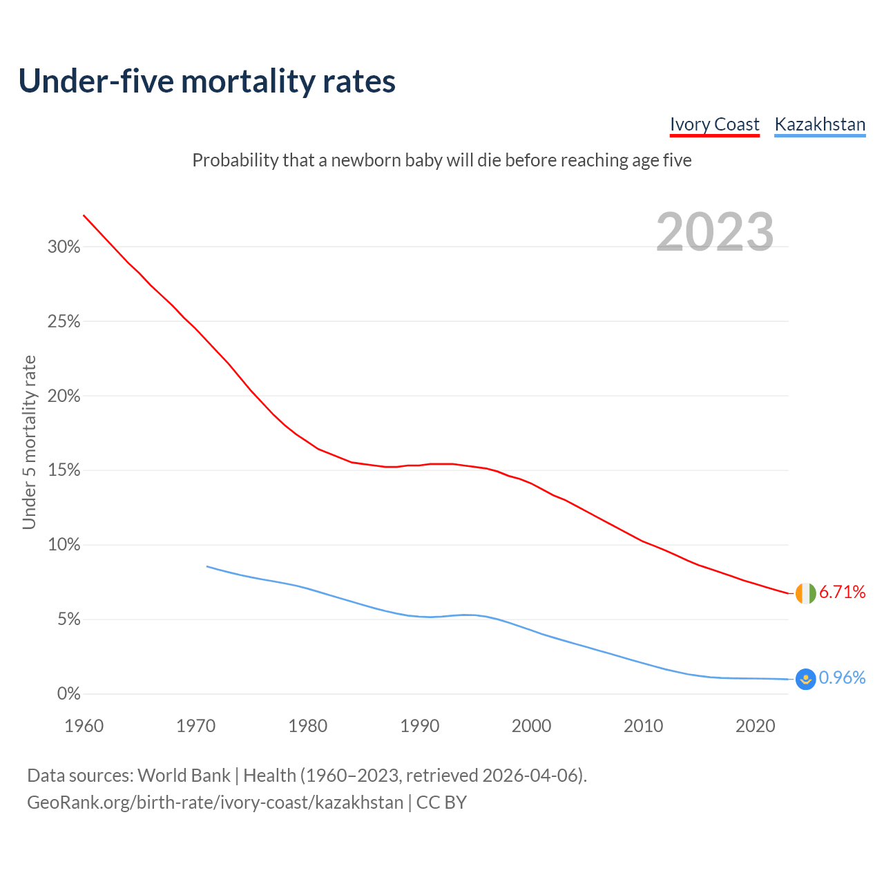 The chance that a newborn baby will die before reaching age five is 6.71% in Ivory Coast and 0.96% in Kazakhstan. Above is a chart with historical data on under-five mortality rates.