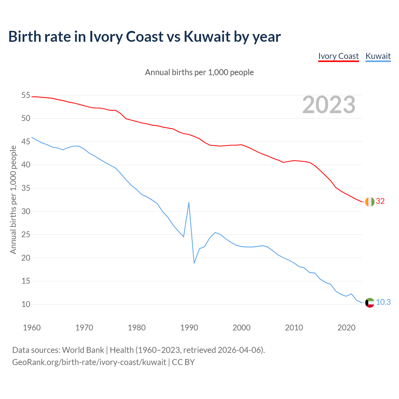 Ivory Coast has an annual birth rate of 32 births per 1,000 people, compared to 10.3 for Kuwait. The average number of children a woman is expected to have during her lifetime — the fertility rate, is 4.28 in Ivory Coast and 1.52 in Kuwait — 64.4% difference.