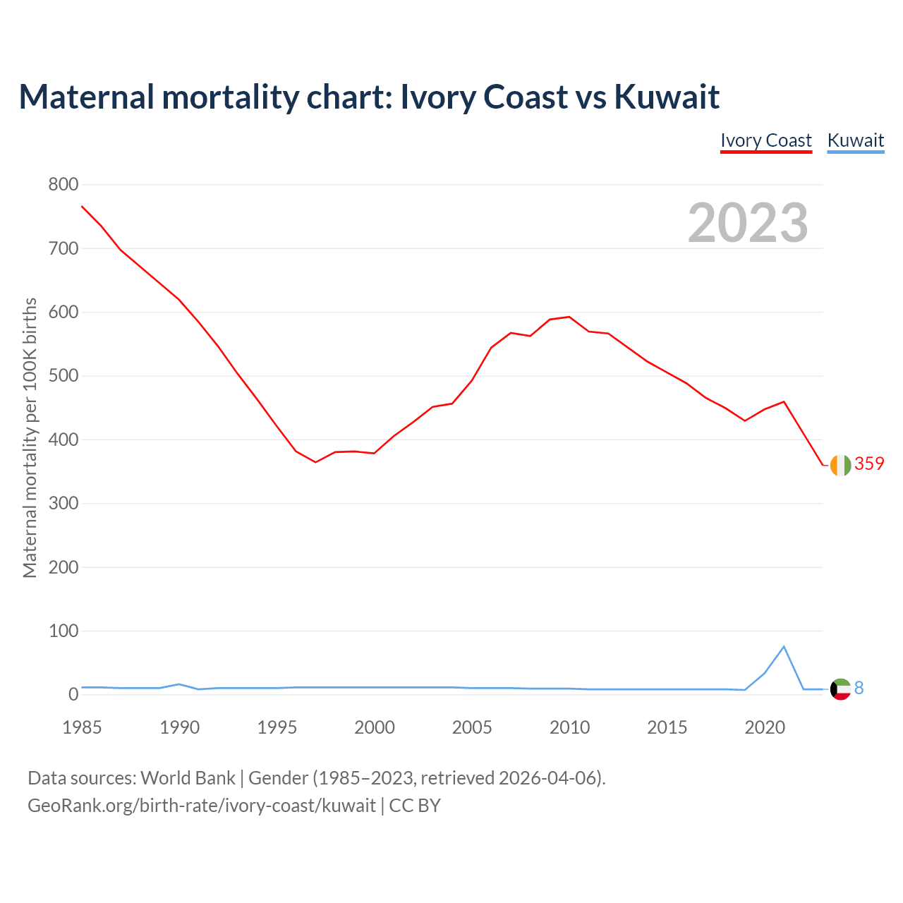 The maternal mortality rate, which is the probability of dying during childbirth or within 42 days of pregnancy termination, is 359 deaths per 100,000 live births in Ivory Coast, compared to 8 deaths in Kuwait.
