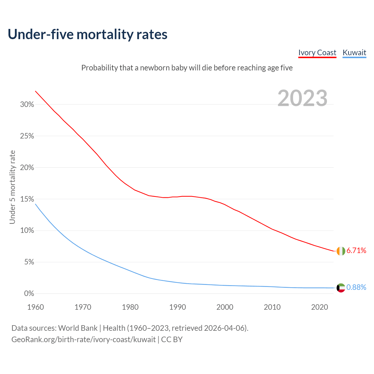 The chance that a newborn baby will die before reaching age five is 6.71% in Ivory Coast and 0.88% in Kuwait. Above is a chart with historical data on under-five mortality rates.
