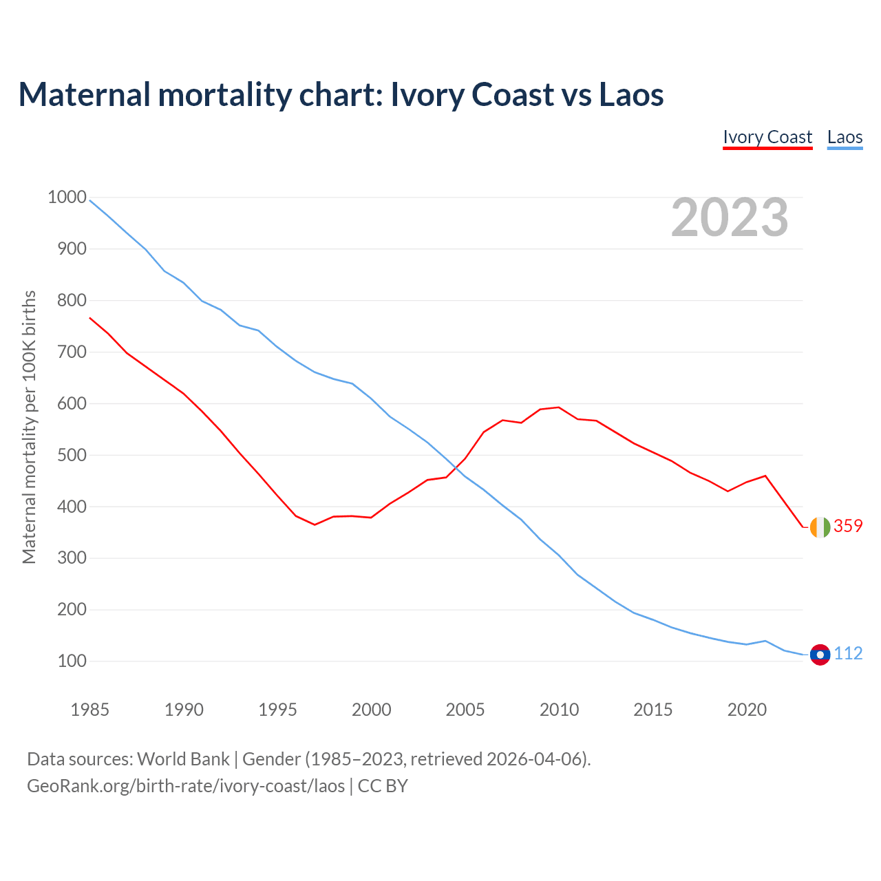 The maternal mortality rate, which is the probability of dying during childbirth or within 42 days of pregnancy termination, is 359 deaths per 100,000 live births in Ivory Coast, compared to 112 deaths in Laos.