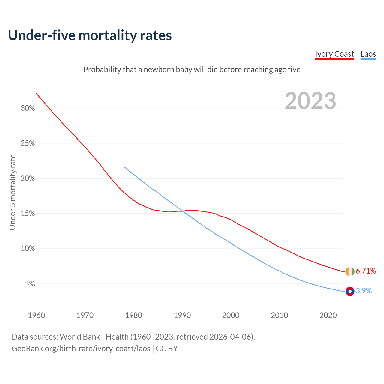 The chance that a newborn baby will die before reaching age five is 6.71% in Ivory Coast and 3.9% in Laos. Above is a chart with historical data on under-five mortality rates.