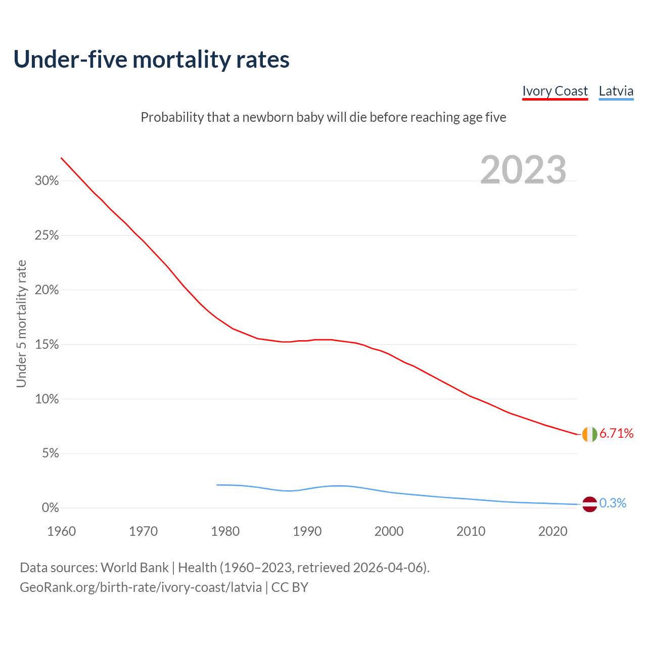 The chance that a newborn baby will die before reaching age five is 6.71% in Ivory Coast and 0.3% in Latvia. Above is a chart with historical data on under-five mortality rates.