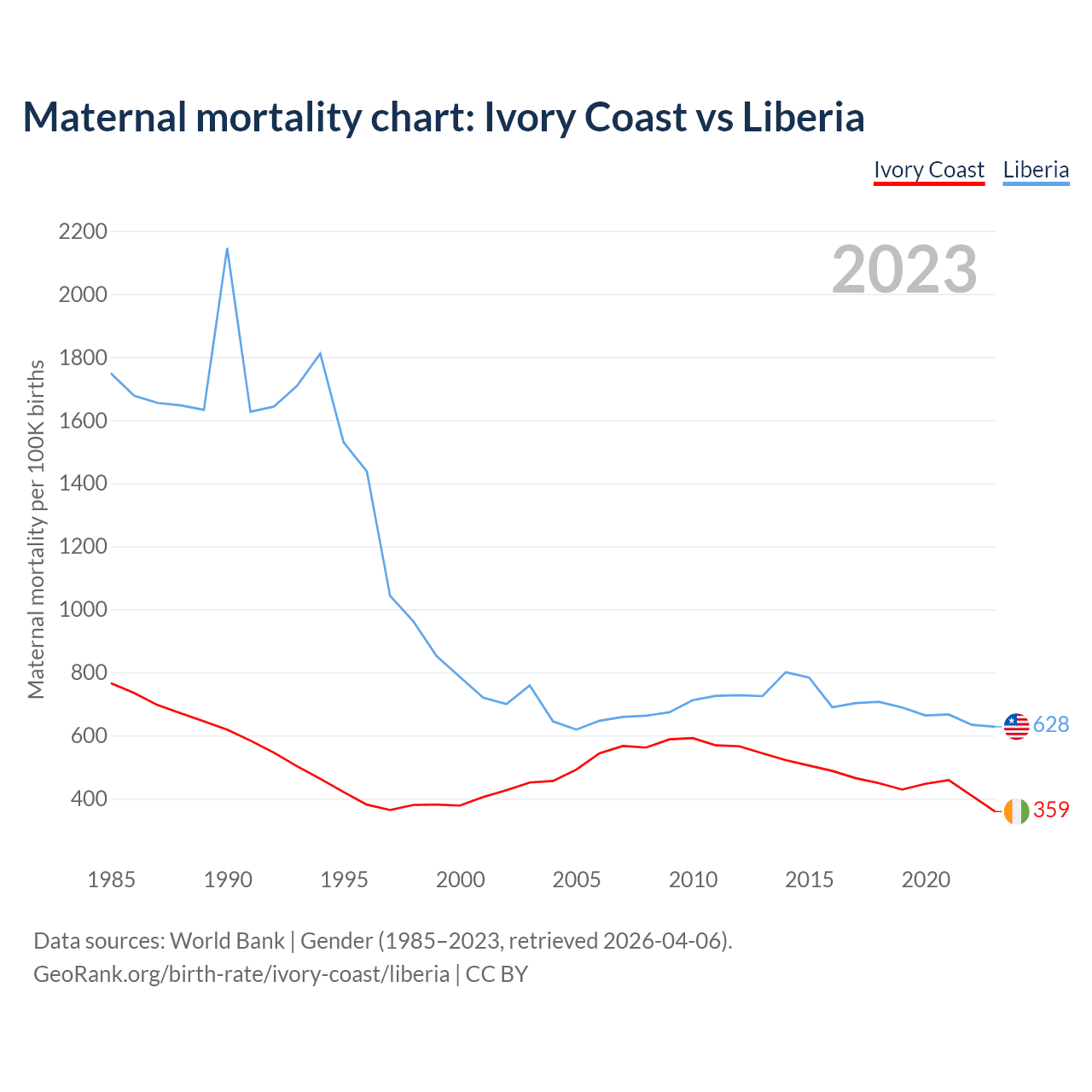 The maternal mortality rate, which is the probability of dying during childbirth or within 42 days of pregnancy termination, is 359 deaths per 100,000 live births in Ivory Coast, compared to 628 deaths in Liberia.