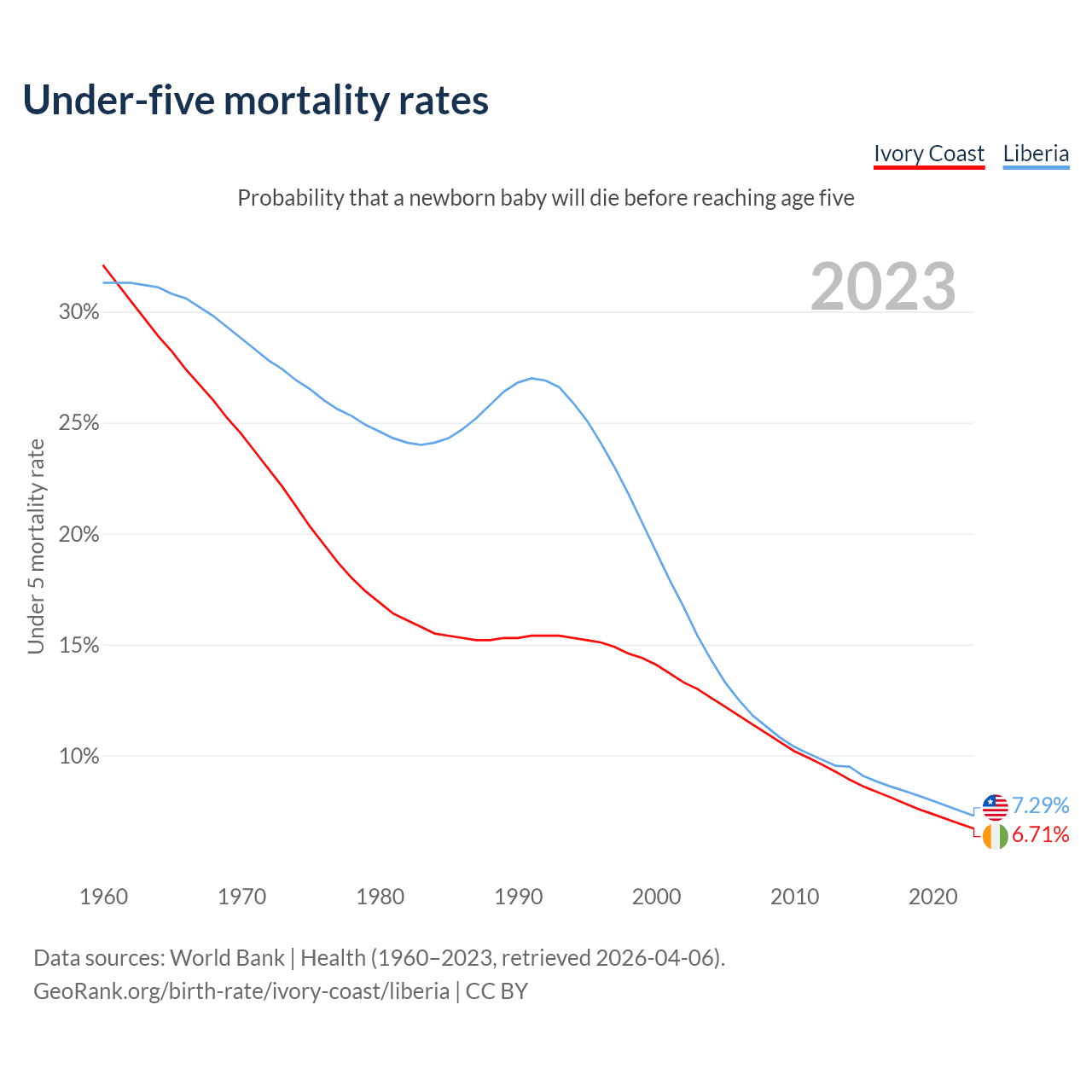 The chance that a newborn baby will die before reaching age five is 6.71% in Ivory Coast and 7.29% in Liberia. Above is a chart with historical data on under-five mortality rates.