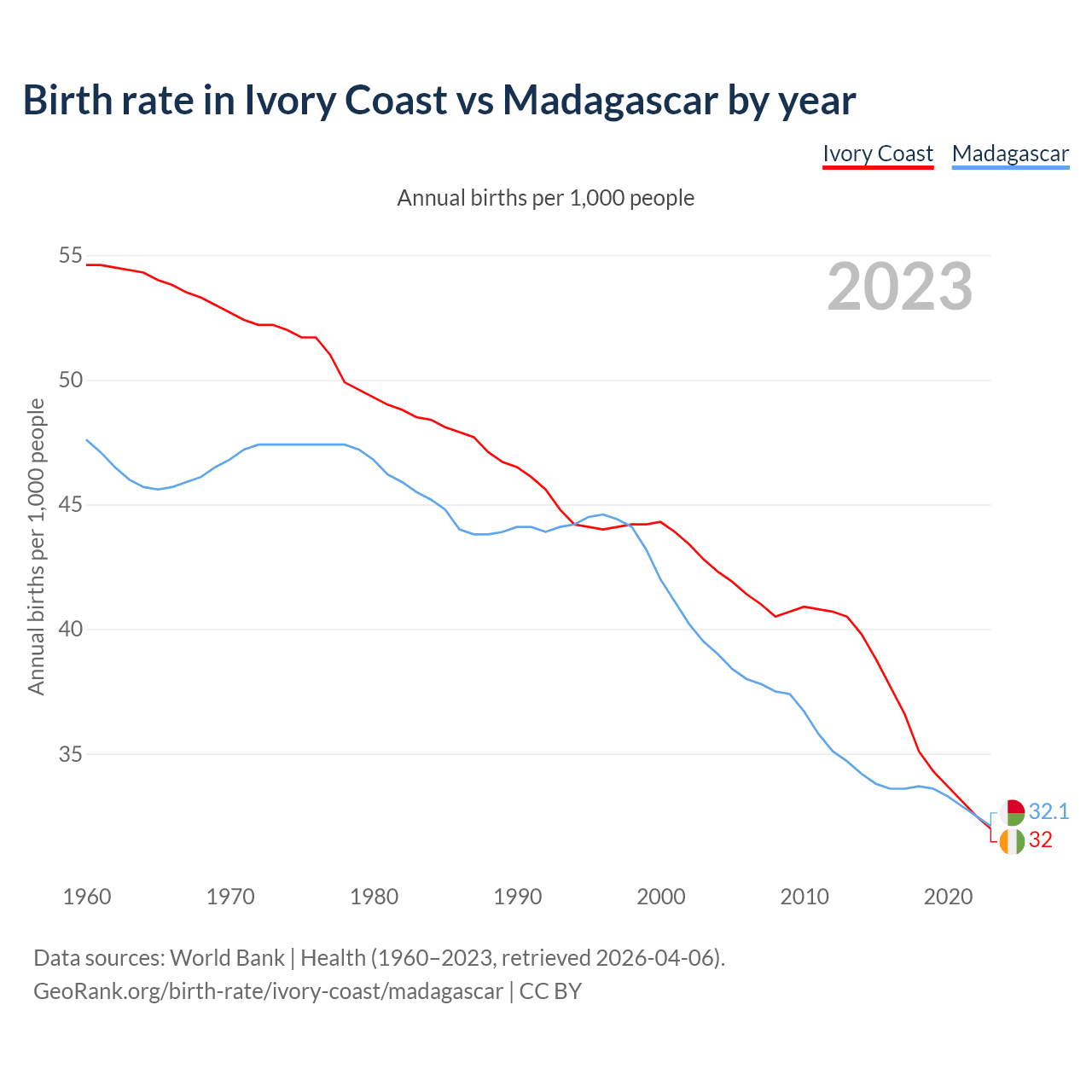 Ivory Coast has an annual birth rate of 32 births per 1,000 people, compared to 32.1 for Madagascar. The average number of children a woman is expected to have during her lifetime — the fertility rate, is 4.28 in Ivory Coast and 3.97 in Madagascar — 7.26% difference.