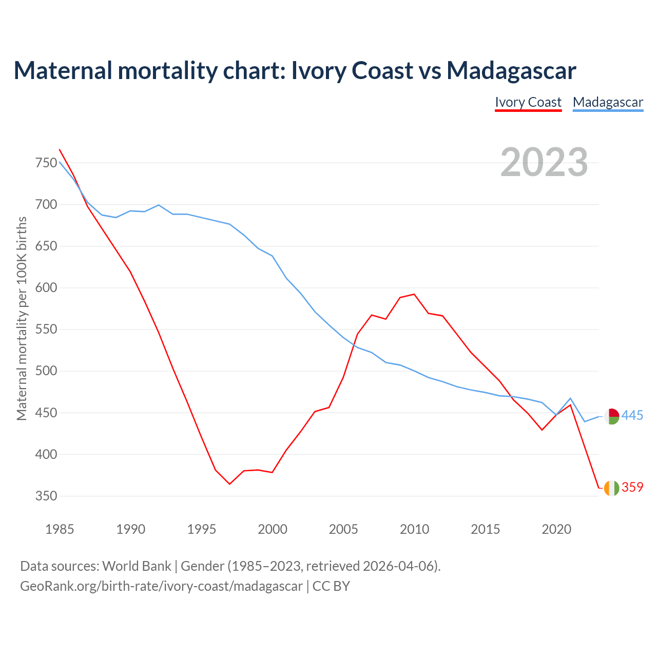 The maternal mortality rate, which is the probability of dying during childbirth or within 42 days of pregnancy termination, is 359 deaths per 100,000 live births in Ivory Coast, compared to 445 deaths in Madagascar.