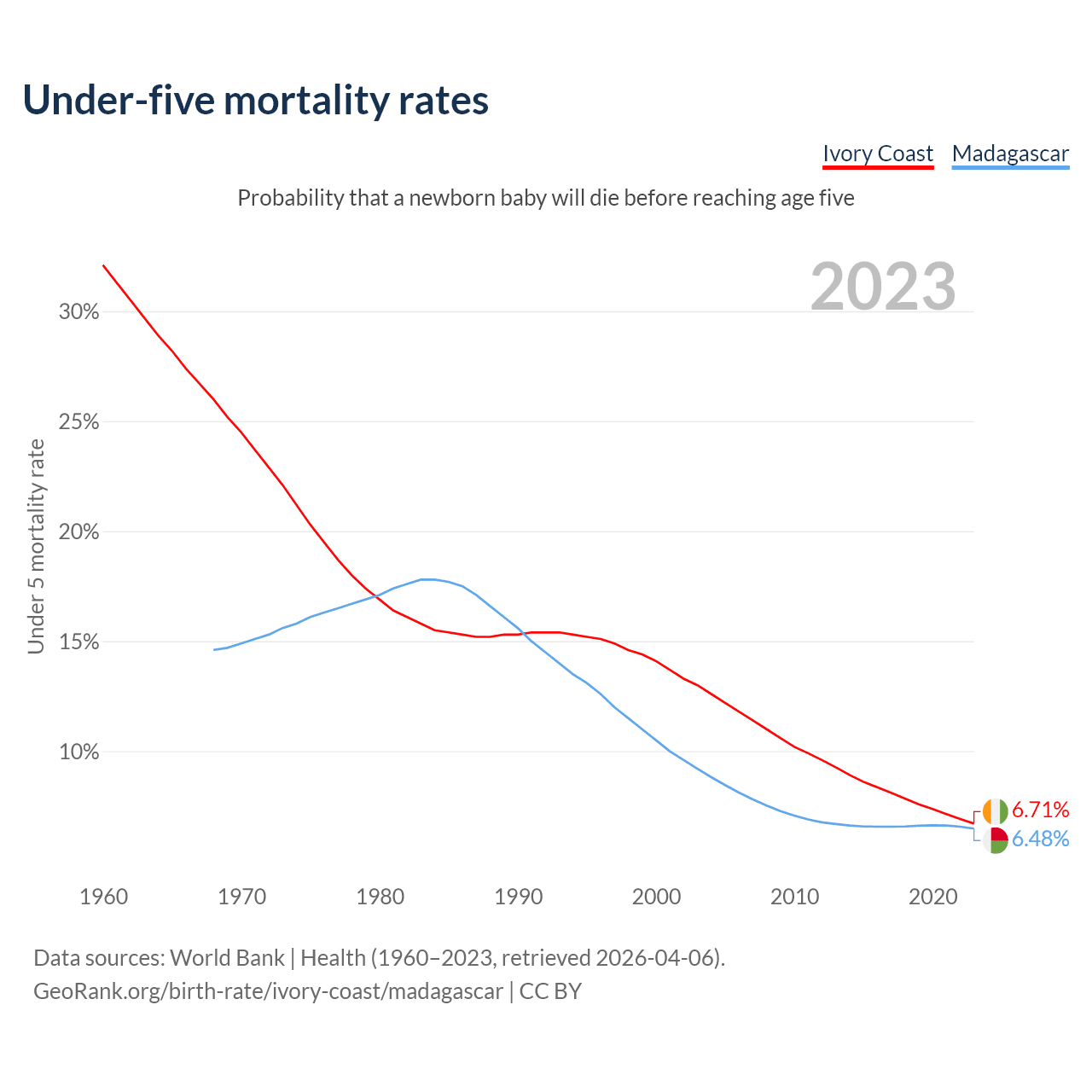 The chance that a newborn baby will die before reaching age five is 6.71% in Ivory Coast and 6.48% in Madagascar. Above is a chart with historical data on under-five mortality rates.