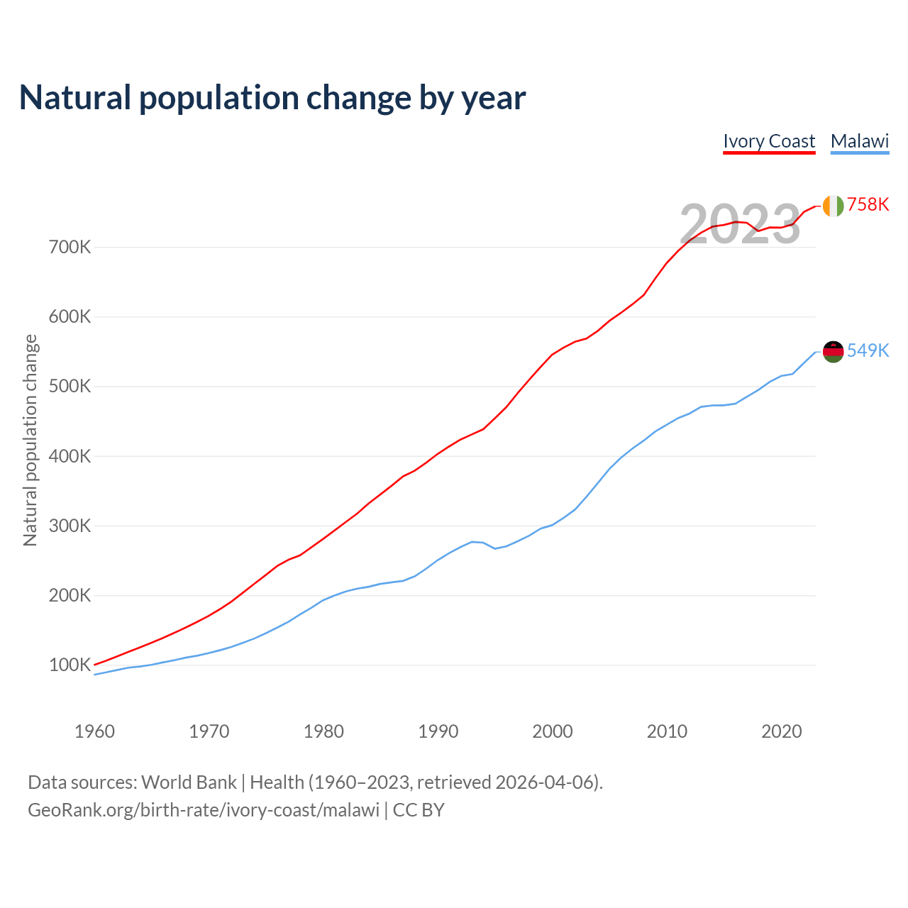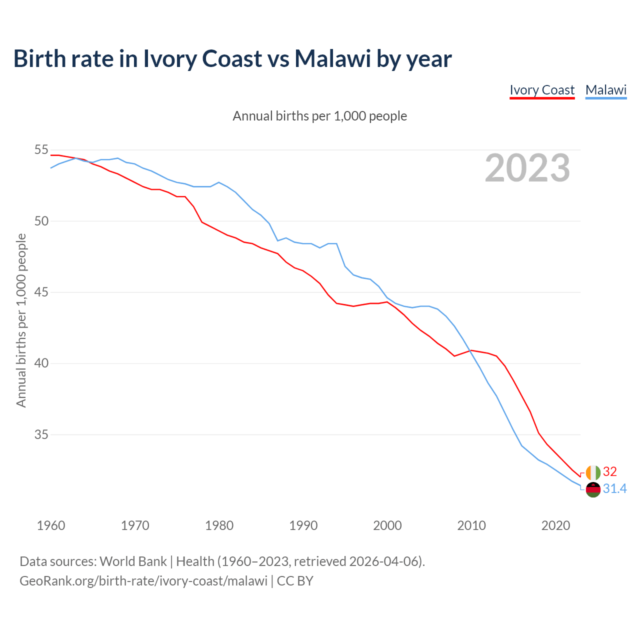 Ivory Coast has an annual birth rate of 32 births per 1,000 people, compared to 31.4 for Malawi. The average number of children a woman is expected to have during her lifetime — the fertility rate, is 4.28 in Ivory Coast and 3.65 in Malawi — 14.8% difference.