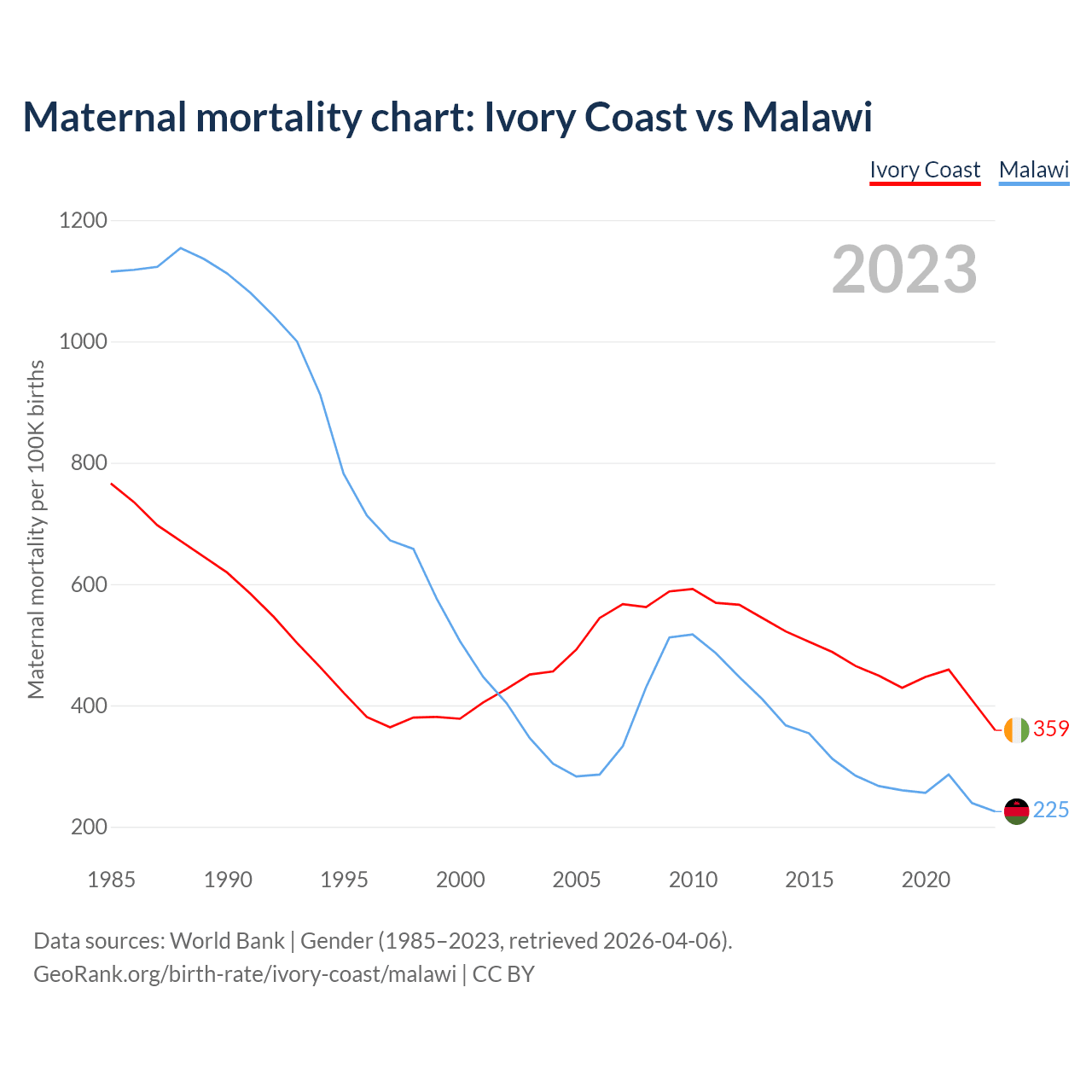 The maternal mortality rate, which is the probability of dying during childbirth or within 42 days of pregnancy termination, is 359 deaths per 100,000 live births in Ivory Coast, compared to 225 deaths in Malawi.
