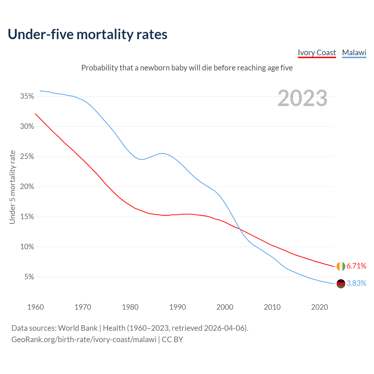 The chance that a newborn baby will die before reaching age five is 6.71% in Ivory Coast and 3.83% in Malawi. Above is a chart with historical data on under-five mortality rates.