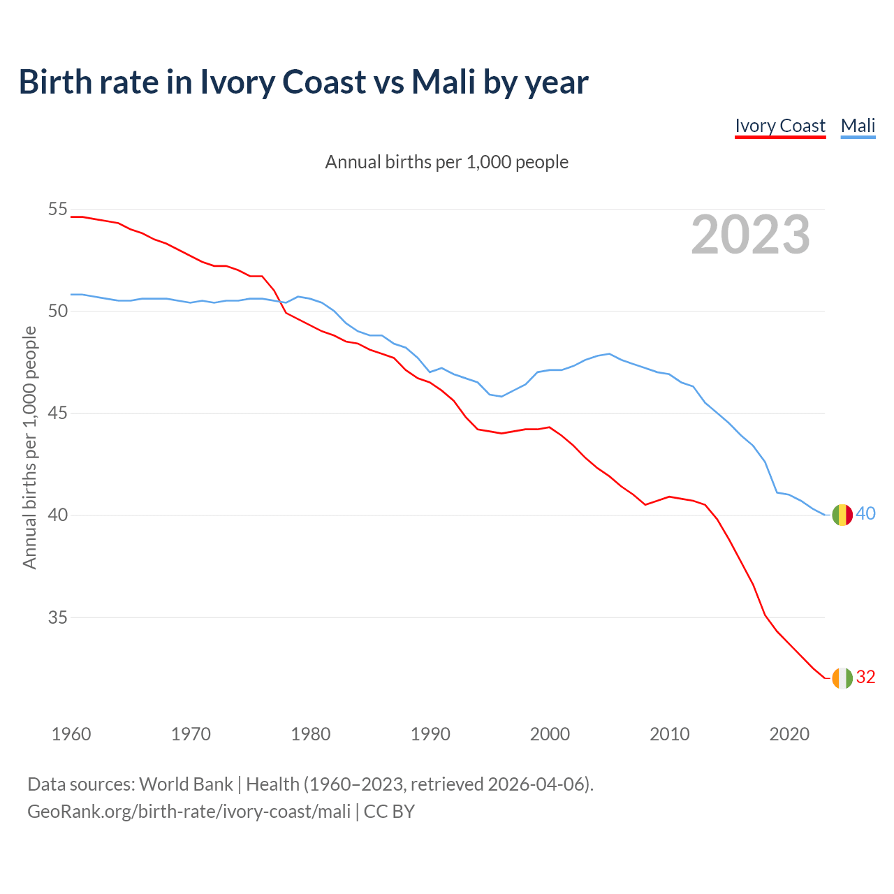 Ivory Coast has an annual birth rate of 32 births per 1,000 people, compared to 40 for Mali. The average number of children a woman is expected to have during her lifetime — the fertility rate, is 4.28 in Ivory Coast and 5.61 in Mali — 31.1% difference.