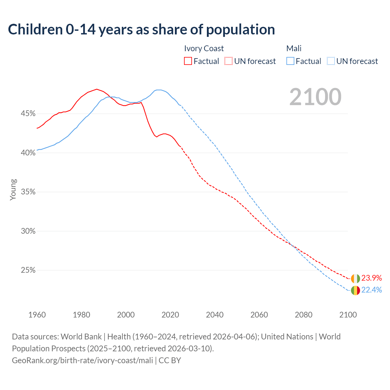 1960 vs 2023, the fertility rate has decreased by 44.3% in Ivory Coast and by 20% in Mali — in 1960, it was 7.69 and 7.02, respectively.