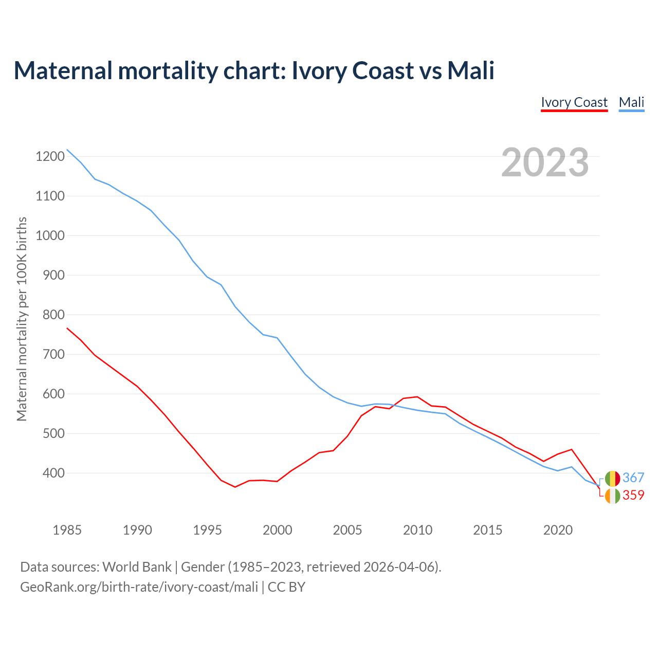 The maternal mortality rate, which is the probability of dying during childbirth or within 42 days of pregnancy termination, is 359 deaths per 100,000 live births in Ivory Coast, compared to 367 deaths in Mali.
