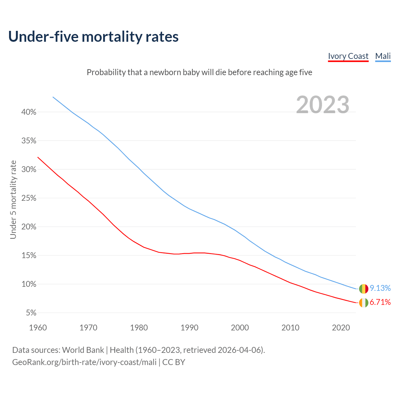 The chance that a newborn baby will die before reaching age five is 6.71% in Ivory Coast and 9.13% in Mali. Above is a chart with historical data on under-five mortality rates.