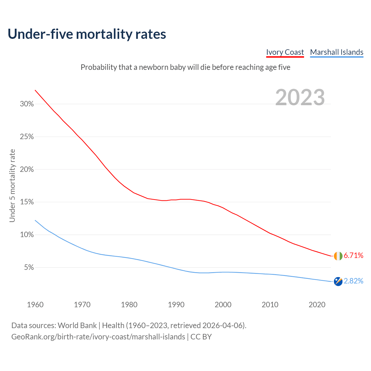 The chance that a newborn baby will die before reaching age five is 6.71% in Ivory Coast and 2.82% in the Marshall Islands. Above is a chart with historical data on under-five mortality rates.